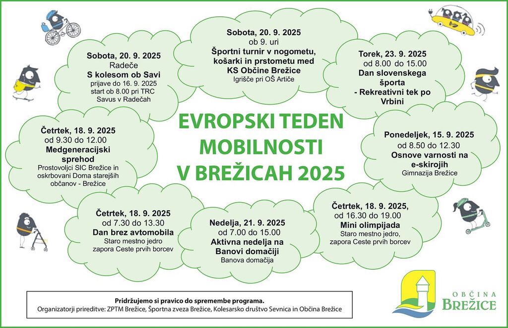 ''Dan brez avtomobila'' je le en izmed vrste dogodkov, s katerimi v Brežicah obeležujemo Evropski teden mobilnosti. Vabimo vas, da si ogledate celoten program in se nam pridružite tudi na preostalih prireditvah. Skupaj lahko spoznamo, kako naše Brežice z okolico postajajo še bolj prijazno okolje za hojo, kolesarjenje in družinske aktivnosti. Doživite, kako lahko z majhnimi spremembami v vsakdanu vsi prispevamo k bolj zdravem okolju in kakovostnemu življenju.