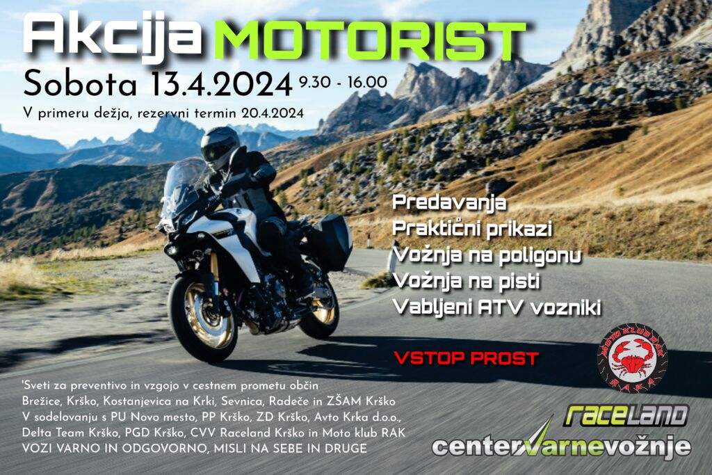 V soboto, 13. 4. 2024, vabljeni v Center varne vožnje Raceland, kjer bo od 9.30 do 16.00 v potekala vsakoletna akcija Motorist.
