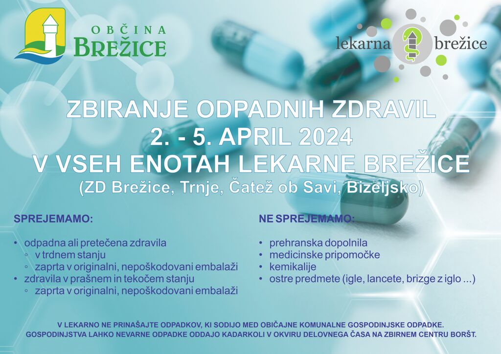 Občina Brežice v sodelovanju z Lekarno Brežice organizira akcijo zbiranja odpadnih zdravil, s katero želimo poudariti pomen pravilnega odlaganja neuporabljenih ali pretečenih zdravil, ki je ključnega pomena za preprečevanje okoljske škode.