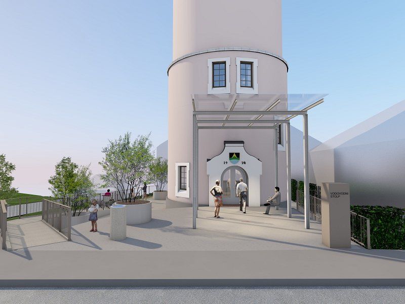 Nad vhodom v stolp bo postavljena nova, višja nadstrešnica, ki bo konstrukcijsko ločena, vendar funkcionalno povezana s stavbo in bo nudila senco oz. zaščito pred vremenskimi vplivi. Ploščad pred stolpom bo opremljena z zasaditvijo v premičnih koritih z rastjem. Nova zasnova v ospredje postavlja stavbo in njene elemente kot del izjemne tehniške dediščine, ki svojim obiskovalcem približuje njeno delovanje in ustrezno umestitev v kontekst časa.