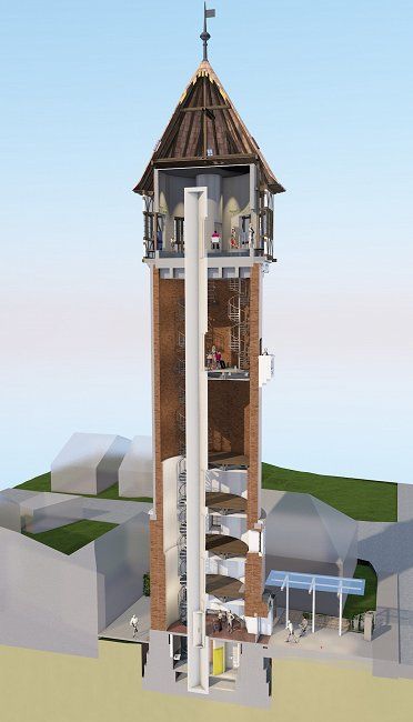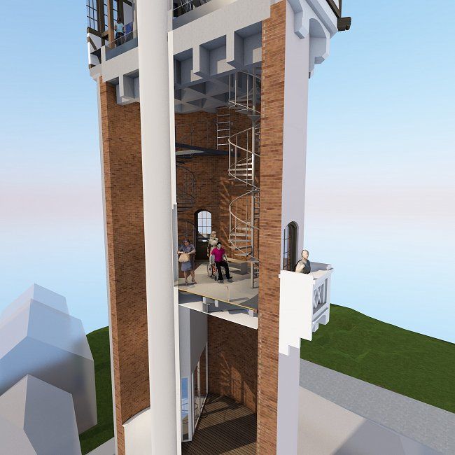 Vgrajeno dvigalo nosilnosti do 8 oseb bo ustrezno za invalide na vozičku s spremstvom. Na nivoju vodohrana bo izveden preboj sten, ki bo obiskovalce pripel do obstoječih oken v osmerokotnem lesenem ovoju rezervoarja. Spodnji del rezervoarja bo napolnjen z vodo v višini cca. 30 cm, nad tem pa bodo izvedena steklena tla, ki bodo spominjala obiskovalce na prvotno funkcijo vodovodnega stolpa.