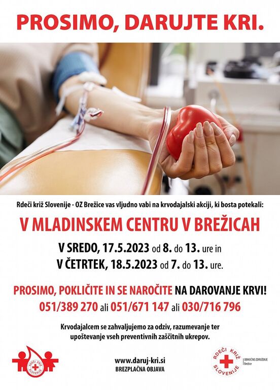 Darovanje krvi je gotovo ena najplemenitejših oblik pomoči sočloveku, zato vabljeni na krvodajalski akciji 17. maja od 8.00 do 13.00 in 18. maja od 7.00 do 13.00 v Mladinski center Brežice.