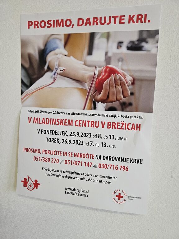 Območno združenje Rdečega križa Brežice v sodelovanju z RKS, ZZTM Ljubljana in Občino Brežice organizira krvodajalsko akcijo v ponedeljek, 25. septembra in v torek, 26. septembra 2023.
