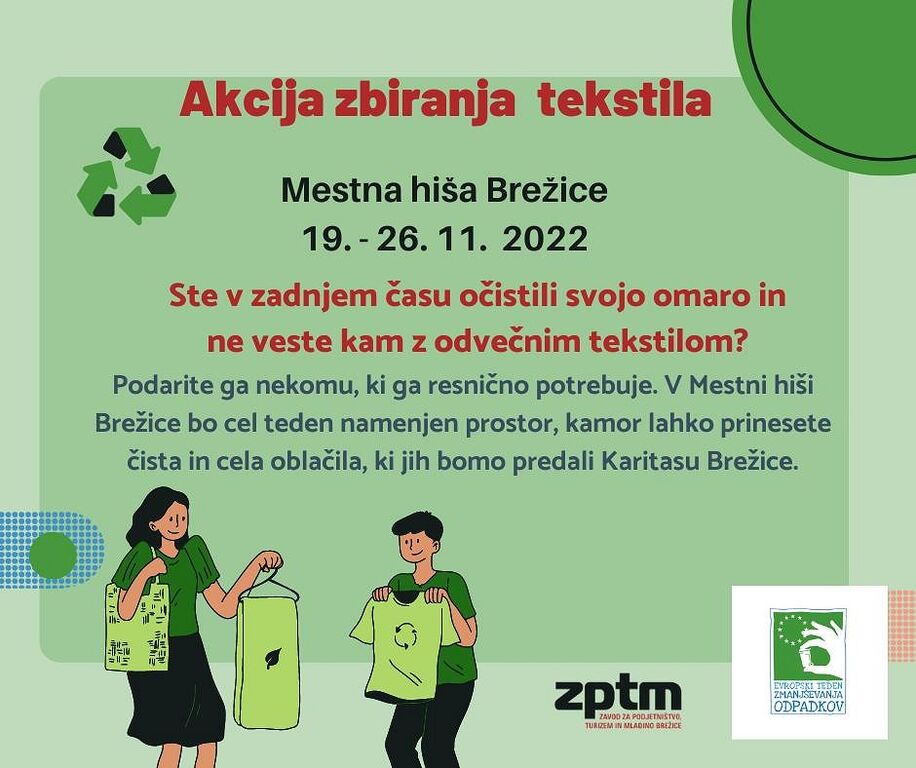 V okviru Evropskega tedna zmanjševanja odpadkov v je Mestni hiši Brežice že cel teden namenjen prostor, kjer ljudje lahko prinesejo čista in cela oblačila, ki se bodo predala Karitas Brežice.