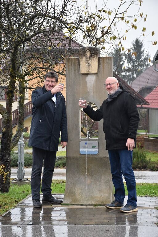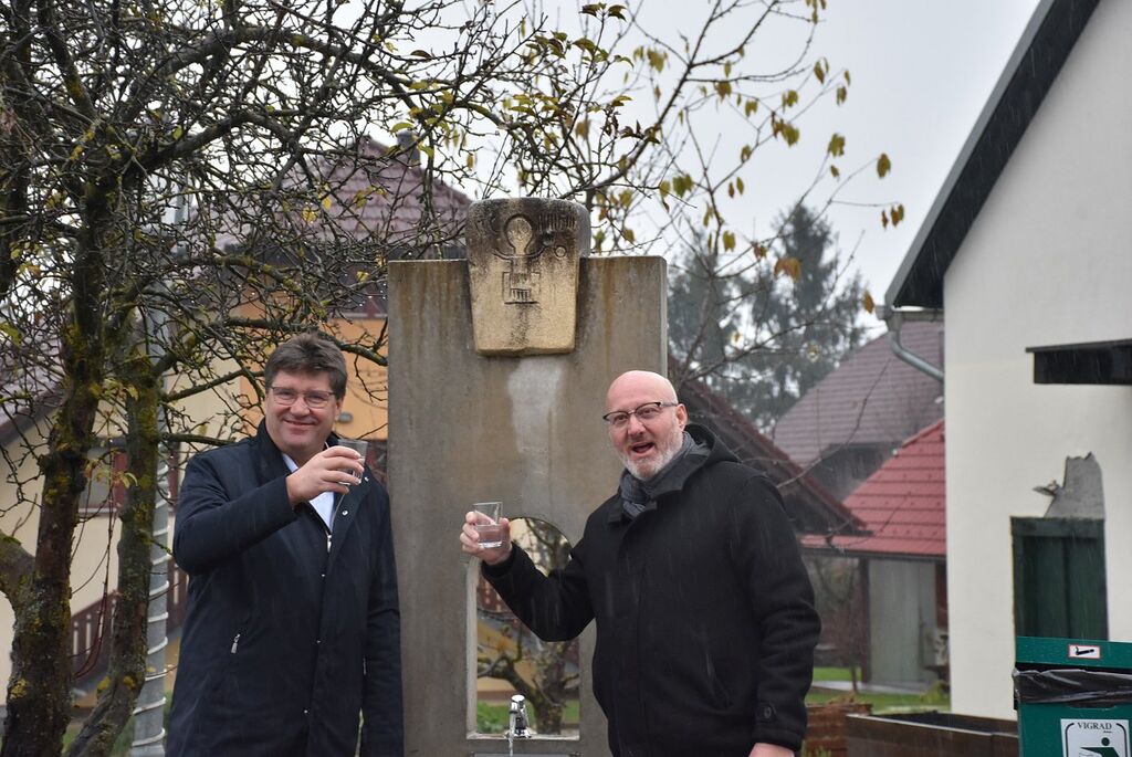 Bistrica ob Sotli, 13. december - Župan Občine Brežice Ivan Molan in župan Občine Bistrica ob Sotli Franjo Debelak sta ob zaključku izvedbe gradbenih del na novinarski konferenci predstavila rezultate in cilje projekta Hidravlične izboljšave vodovodnega sistema v občinah Brežice in Bistrica ob Sotli. Župana sta izpostavila pomen nemotene oskrbe z neoporečno pitno vodo za občane in uspešno sodelovanje med obema občinam, kar je značilno za Posavje, je poudaril župan Franjo Debelak. Župana sta ob zaključku novinarske konference simbolično nazdravila z vodo iz pitnika, ki stoji pri občinski zgradbi v Bistrici ob Sotli, in je že priključen na novi vodovod.