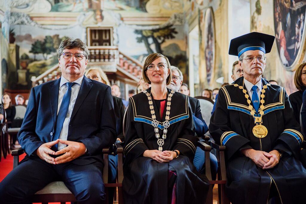 Zbrane goste so v prekrasnem ambientu Viteške dvorane nagovorili tudi rektor Univerze v Mariboru, prof. dr. Zdravko Kačič, nekdanji dekan, prof. dr. Boštjan Brumen in seveda nova dekanica, izr. prof. dr. Marjetka Rangus. V svojem govoru je med drugim poudarila številne raziskovalne in pedagoške dosežke še ne 15-letne Fakultete, sodelovanje tako v lokalnem kot mednarodnem okolju. ''Fakulteta smo mi vsi. Hvala vam za podporo. Potrudila se bom ostati prilagodljiva še naprej, strast do dela pa zagotovo ni vprašanje,'' se je nova dekanica z besedami zahvalila tudi sodelavkam in sodelavcem, študentkam in študentom.