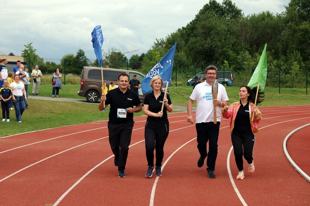 Po obisku veličastne viteške dvorane so jo člani različnih lokalnih športnih društev in osnovnih ter srednjih šol ponesli mimo vodovodnega stolpa na prenovljeni atletski stadion Brežice, kjer je potekala osrednja prireditev. Plamenico je na stadion prinesla atletinja Leja Glojnarič (Parašportnica leta 2023 in dvakratna olimpijska prvakinja na Olimpijadi gluhih), nato je krog s Slovensko baklo opravil tudi župan Ivan Molan, pa predstavniki različnih klubov, društev, šol in organizacij. Zadnji krog je pripadel Niki Glojnarič, ki se bori za nastop na OI v Parizu.