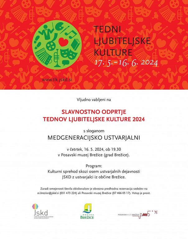 Otvoritev Tednov ljubiteljske kulture bo v četrtek, 16. maja, ob 19.30 v Gradu Brežice. Program ob odprtju bo v obliki kulturnega sprehoda skozi osem ustvarjalnih dejavnosti JSKD na različnih grajskih prizoriščih. Z različnimi točkami se bodo predstavili otroški, mladinski in odrasli kulturni ustvarjalci iz brežiške občine, voditeljica večera pa bo dramska igralka Sara Dirnbek. Zbrane bodo v dvorani nagovorili direktor JSKD Damjan Damjanovič, predsednica Zveze kulturnih društev Slovenije Maja Jerman Bratec, župan Brežic Ivan Molan in predstavnik Ministrstva za kulturo.
