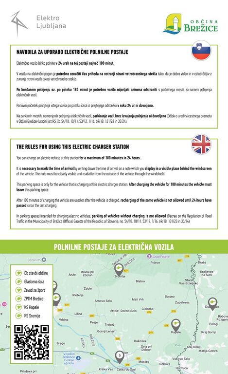 - Ponovni pričetek polnjenja istega vozila po poteku časa iz prejšnjega odstavka v roku 24 ur ni dovoljeno. Na parkirnih mestih, namenjenih polnjenju električnih vozil, parkiranje vozil brez izvajanja polnjenja ni dovoljeno (Odlok o ureditvi cestnega prometa v Občini Brežice (Uradni list RS, št. 54/10, 18/11, 53/12, 1/16, 69/18, 131/23 in 35/24).