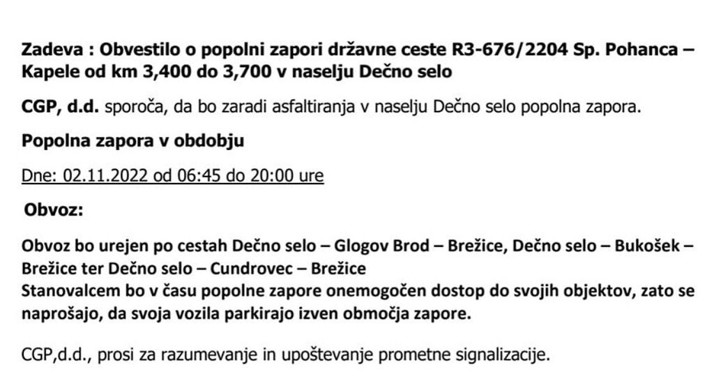 Podjetje CGP, d.d. sporoča, da bo zaradi asfaltiranja v naselju Dečno selo popolna zapora državne ceste v sredo, 2. novembra 2022 od 06:45 do 20:00. Obvoz bo urejen po cestah Dečno selo – Glogov Brod – Brežice, Dečno selo – Bukošek – Brežice ter Dečno selo – Cundrovec – Brežice.