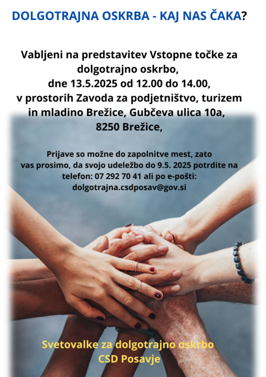 Prijave na predstavitev so možne do zapolnitve mest, zato prosijo, da svojo udeležbo potrdite do petka, 9. 5. 2025, na telefon: 07 292 70 41 ali po e-pošti: dolgotrajna.csdposav@gov.si