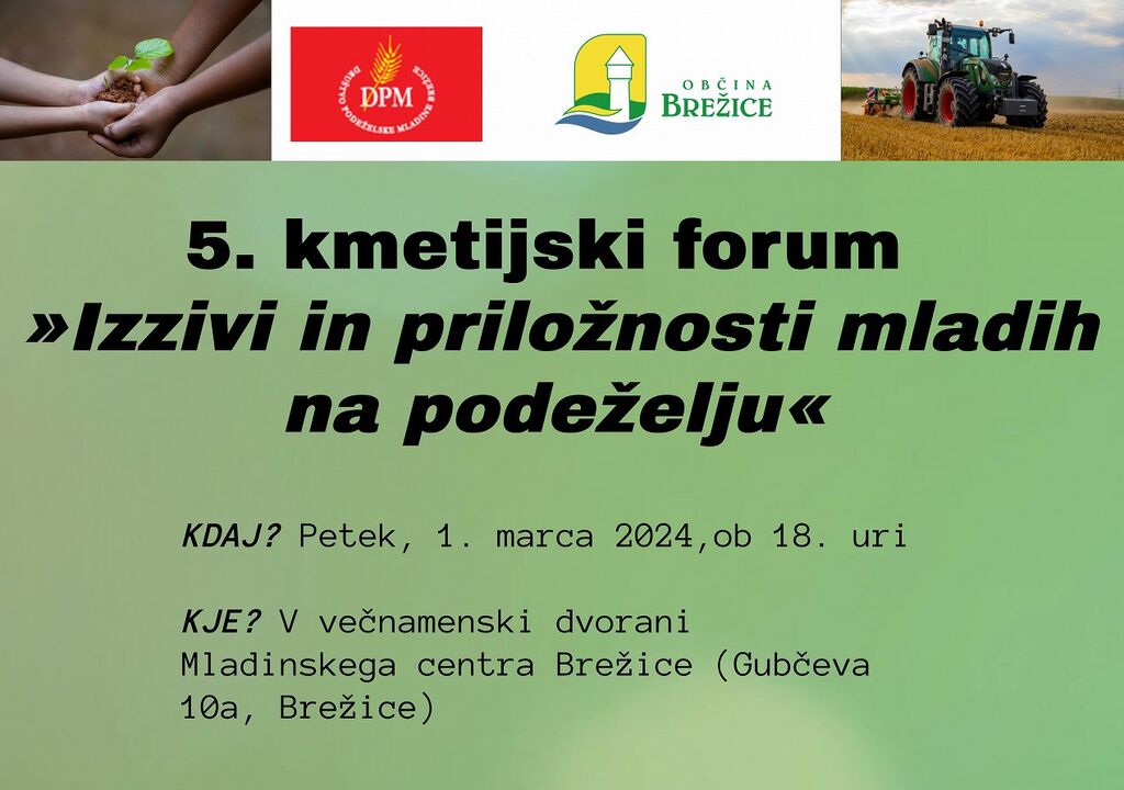 Občina Brežice se zaveda pomen kmetijstva v naši občini in tudi tega, da je obstoj in razvoj neke panoge odvisen predvsem od mladih, zato vas v sodelovanju z Društvom podeželske mladine Brežice vabimo na 5. kmetijski forum »Izzivi in priložnosti mladih na podeželju«, ki bo potekal v petek, 1. marca 2024, s pričetkom ob 18. uri v večnamenski dvorani Mladinskega centra Brežice (Gubčeva 10a, Brežice).