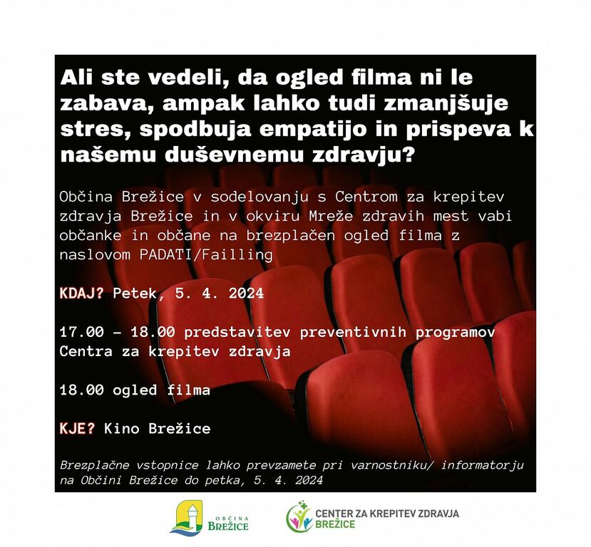 Občina Brežice v sodelovanju s Centrom za krepitev zdravja Brežice in v okviru Mreže zdravih mest vabi občanke in občane na brezplačen ogled filma z naslovom PADATI/ Falling.