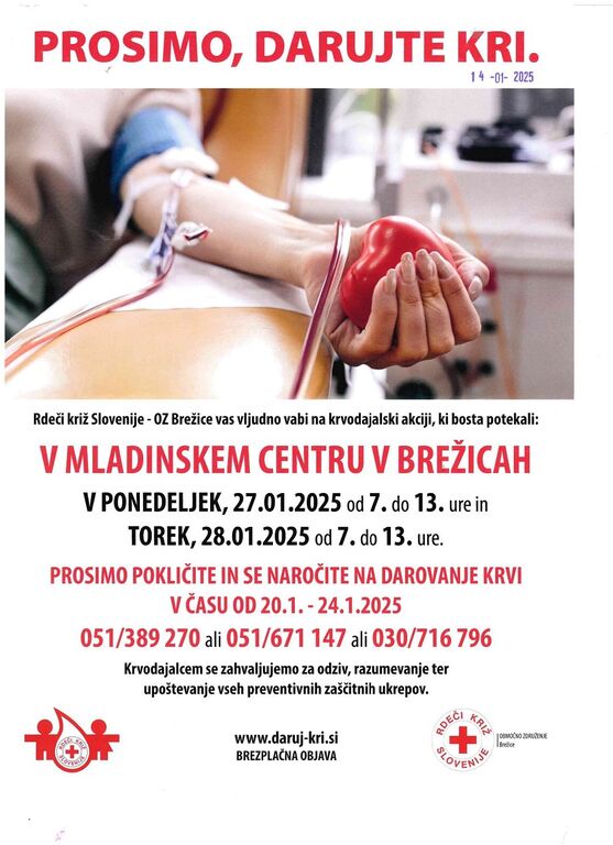 Na darovanje krvi se je potrebno predhodno naročiti v času od 20. 1. 2025 do 24. 1. 2025 na 051 389 270 ali 051 671 147 ali 030 716 796.
