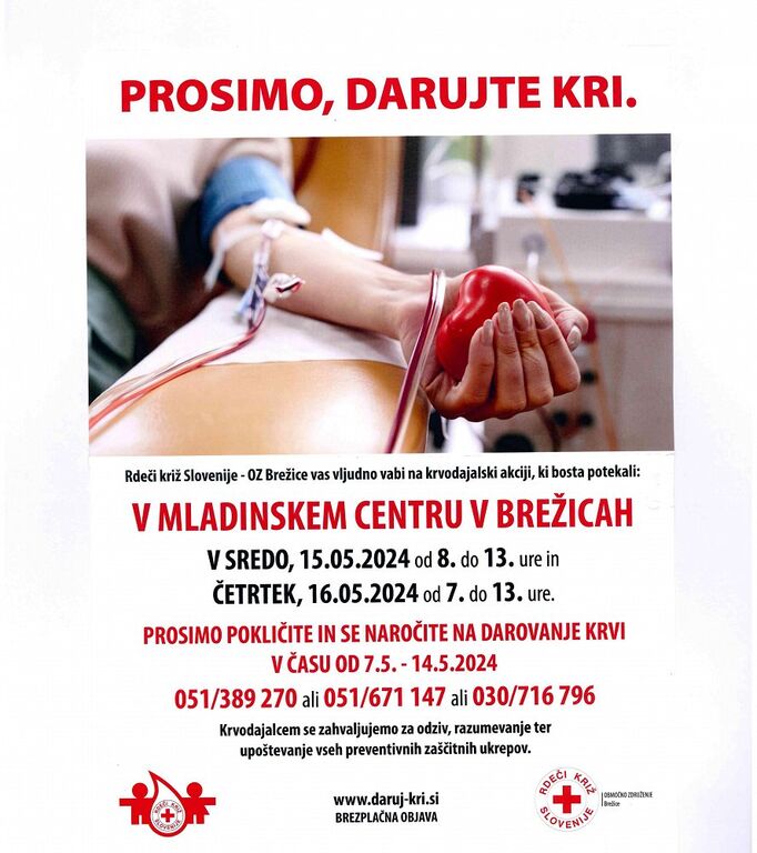 Območno združenje Rdečega križa Brežice vabi na krvodajalski akciji v Brežice, ki bosta potekali v sredo, 15. maja 2024 z vpisom od 8.00 do 13.00 ure in v četrtek, 16. maja 2024 z vpisom od 7.00 do 13.00 ure. Krvodajalski akciji bosta potekali v prostorih Mladinskega centra Brežice (Gubčeva ulica 10a, Brežice).