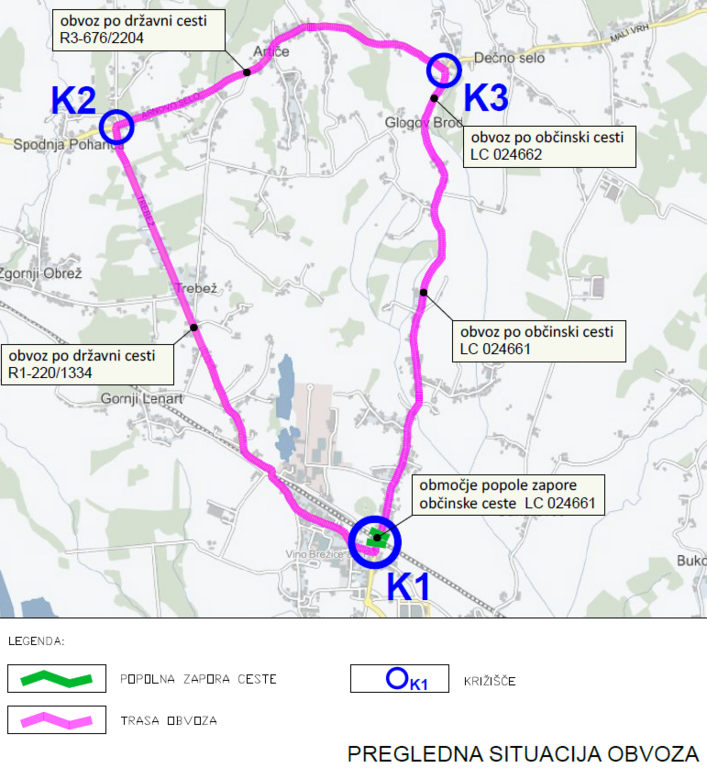 Obvoz bo ustrezno označen in bo potekal po občinski cesti 024661 Šentlenart–Glogov Brod, nato po občinski cesti 024662 Glogov Brod–Dečno selo, dalje po državni cesti R3-676/2204 Sp. Pohanca–Kapele ter po državni cesti R1-220/1334 Krško–Brežice, in obratno. Obvoz je primeren za vsa vozila.