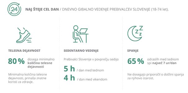 Redna telesna dejavnost je eden ključnih dejavnikov zdravega življenjskega sloga. Prispeva k preprečevanju številnih kroničnih bolezni ter zmanjšuje tveganje za prezgodnjo smrt. Nezadostna telesna dejavnost oziroma sedentarno vedenje je vedenjski dejavnik tveganja, ki ga tesno povezujemo z različnimi motnjami in kroničnimi boleznimi. Daljše in neprekinjeno sedenje negativno vpliva tudi na zdravje posameznikov, ki so sicer redno telesno dejavni v skladu s smernicami. Kakovostno spanje je eden najpomembnejših dejavnikov, ki celostno vpliva na ohranjanje in izboljševanje telesnega in duševnega zdravja ter dobrega počutja vsakega posameznika.