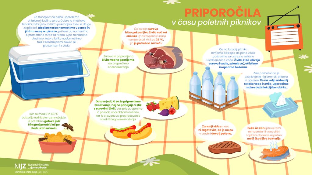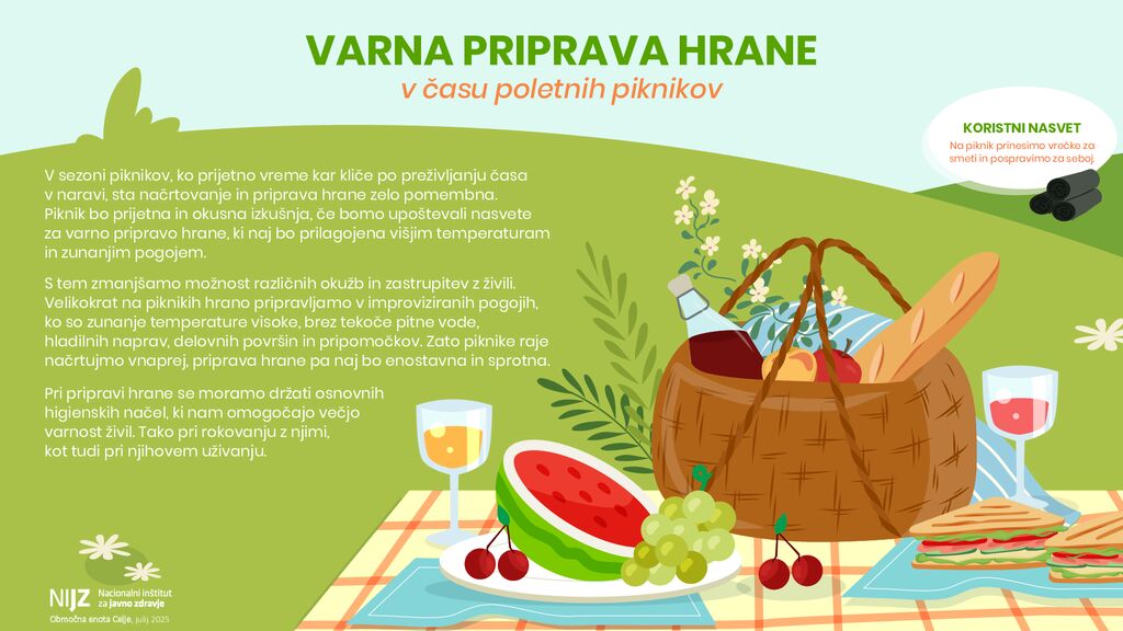V sezoni piknikov, ko prijetno vreme kar kliče po preživljanju časa v naravi, sta načrtovanje in priprava hrane zelo pomembna. Piknik bo prijetna in okusna izkušnja, če bomo upoštevali nasvete za varno pripravo hrane, ki naj bo prilagojena višjim temperaturam in zunanjim pogojem. S tem zmanjšamo možnost različnih okužb in zastrupitev z živili. Velikokrat na piknikih hrano pripravljamo v improviziranih pogojih, ko so zunanje temperature visoke, brez tekoče pitne vode, hladilnih naprav, delovnih površin in pripomočkov. Zato piknike raje načrtujmo vnaprej, priprava hrane pa naj bo enostavna in sprotna.