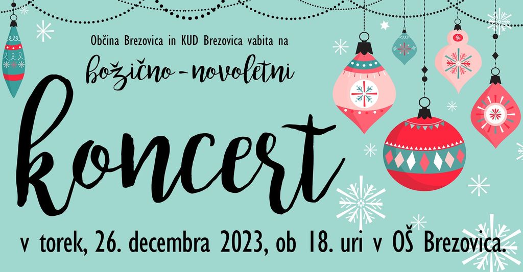 Leto je bilo hitro naokrog. Občina Brezovica in pevke Ženskega pevskega zbora Brezovica vas tako spet vabimo na tradicionalni božično-novoletni koncert z gosti. Zagotovo je najlepše, da se od starega leta poslovimo in novemu letu nazdravimo s pesmijo. Pridružite se nam, da skupaj podoživimo čarobno praznično vzdušje miru in veselja.