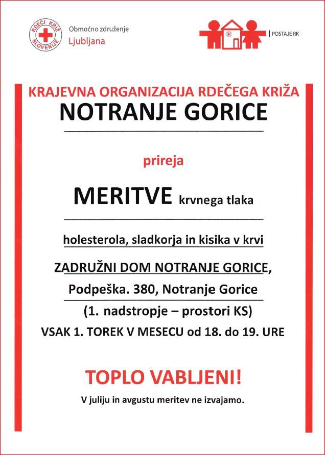 Vabljeni na meritve v ZADRUŽNI DOM NOTRANJE GORICE, Podpeška c. 380, Notranje Gorice (1. nadstropje-prostori KS)