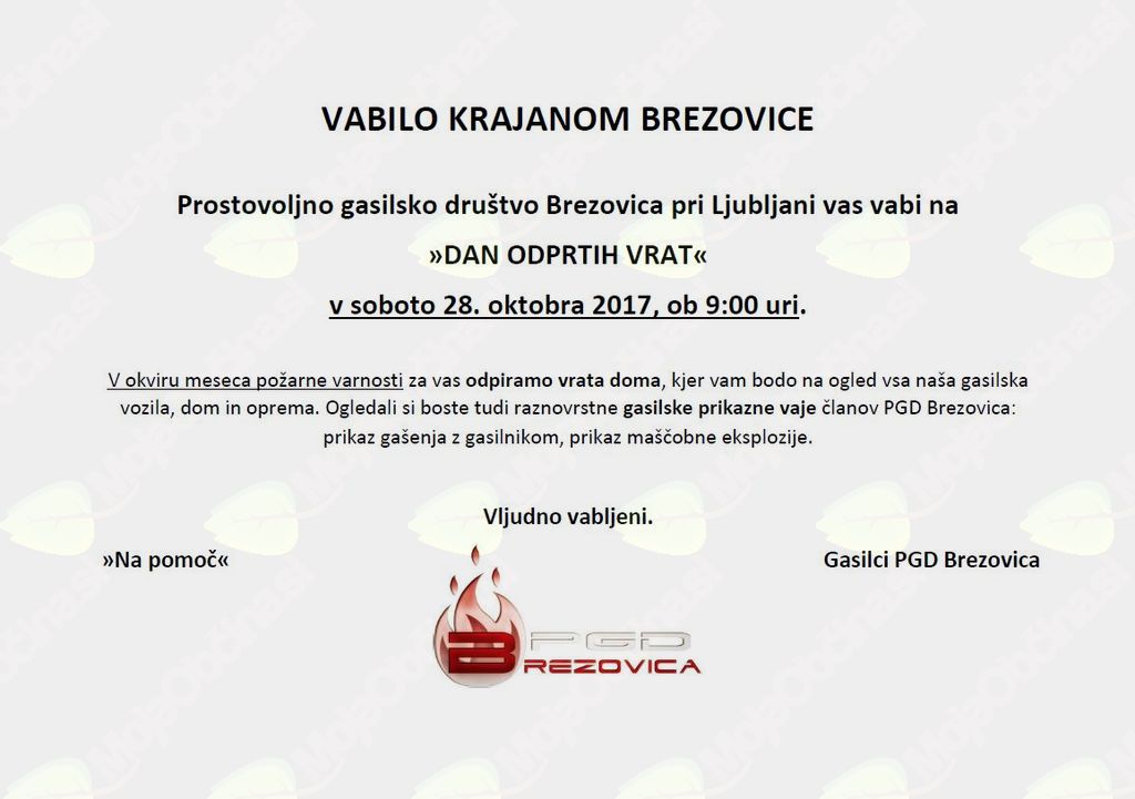 V okviru meseca požarne varnosti za vas odpiramo vrata doma, kjer vam bodo na ogled vsa naša gasilska vozila, dom in oprema. Ogledali si boste tudi raznovrstne gasilske prikazne vaje članov PGD Brezovica: prikaz gašenja z gasilnikom, prikaz maščobne eksplozije...