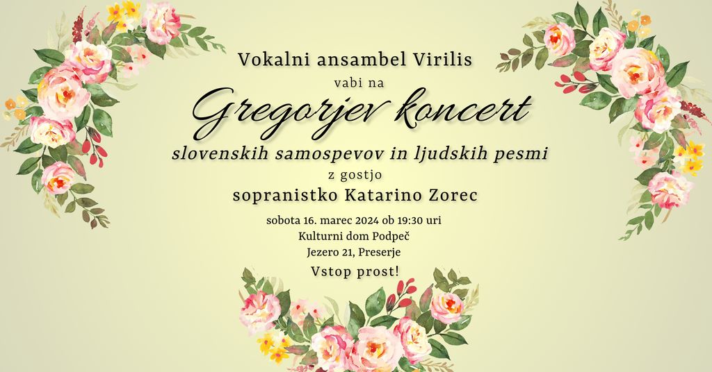 Lepo vabljeni na Gregorjev koncert Vokalnega ansambla Virilis, ki bo v soboto 16. marca ob 19:30 uri v Kulturnem domu Podpeč. Na koncertu boste lahko prisluhnili prepoznavnim ljudskim in umetnim ljubezenskim pesmim slovenske zakladnice, kot tudi samospevom avtorjev kot so Benjamin Ipavec, Fran Gerbič, Fran Serafin Vilhar in drugi. Člani ansambla se bodo namreč predstavili tudi kot solisti.