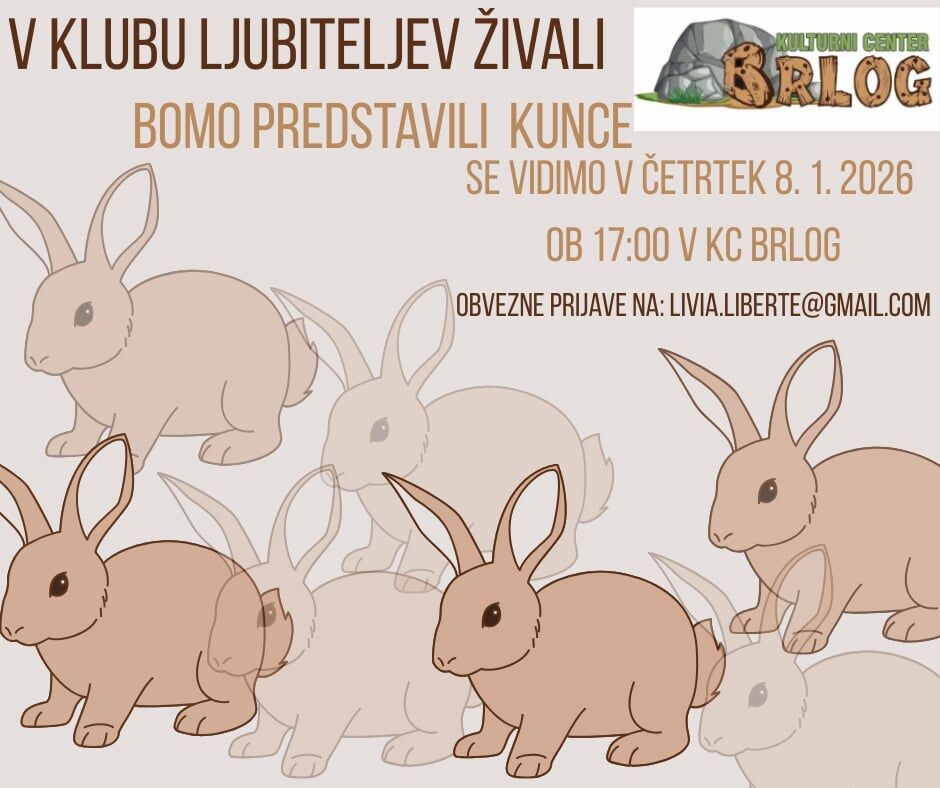 Pridruži se nam na drugem srečanju Kluba ljubiteljev živali. Srečevali se bomo vsak drugi četrtek v mesecu v KC Brlog in vsakokrat bomo spoznavali eno izmed živali. Vabljeni tako otroci, kot odrasli, tisti, ki imate živali doma, ali pa jih (še) nimate!