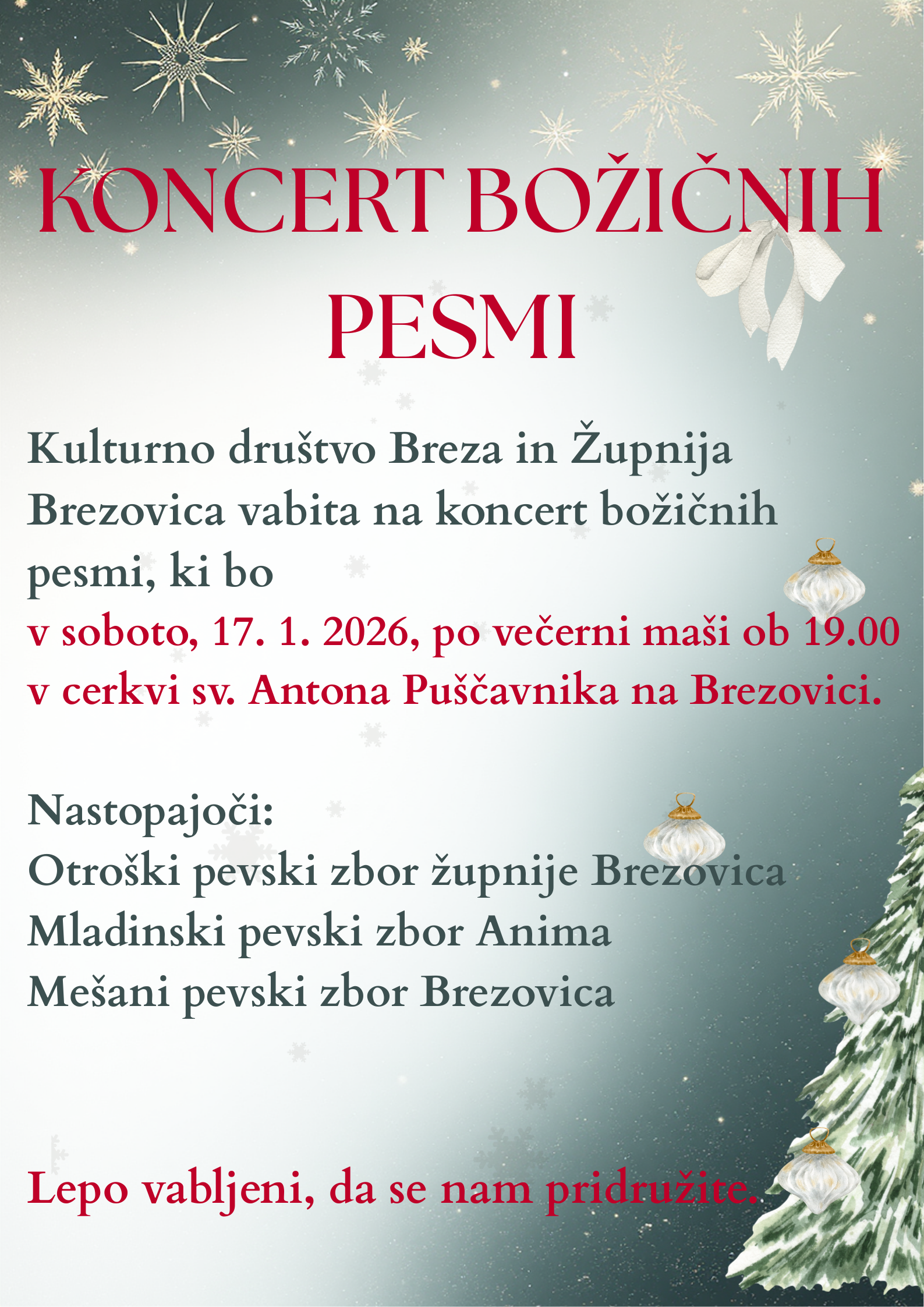 Kulturno društvo Breza in Župnija Brezovica vabita na koncert božičnih pesmi, ki bo v soboto, 17. 1. 2026, po večerni maši ob 19. uri v cerkvi sv. Antona Puščavnika na Brezovici pri Ljubljani.