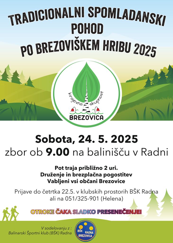 KS Brezovica v sodelovanju z BŠK Radna vabi na tradicionalni spomladanski pohod po Brezoviškem hribu, sobota 24.5. štart ob 9.00.