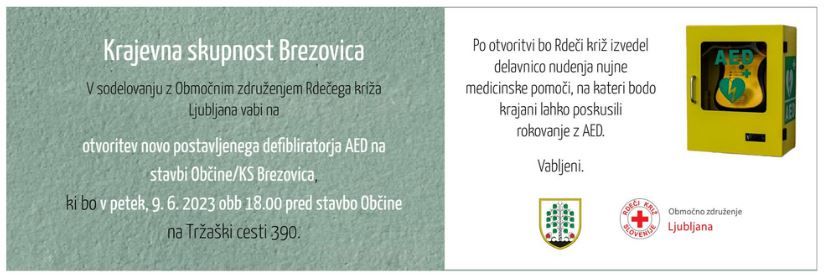 KS Brezovica vabi na dogodek otvoritve uporabe novega AED aparata, ki bo lociran na stavbi KS/Občine Brezovica. Ob tej priložnosti bodo prostovoljci Območnega združenja Rdečega Križa pripravili delavnico uporabe AED za vse krajane. Vabljeni.