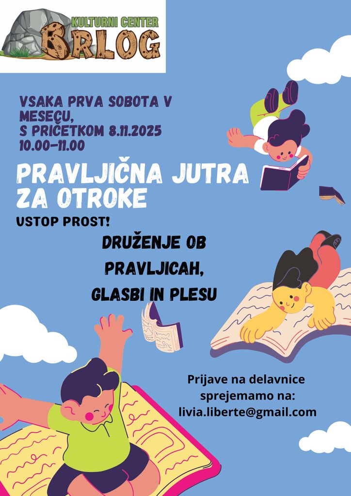 Vsako prvo soboto v mesecu vabljeni v našo pravljično družbo, kjer bomo ob glasbi, ustvarjanju in plesu spoznavali zanimive zgodbe.
