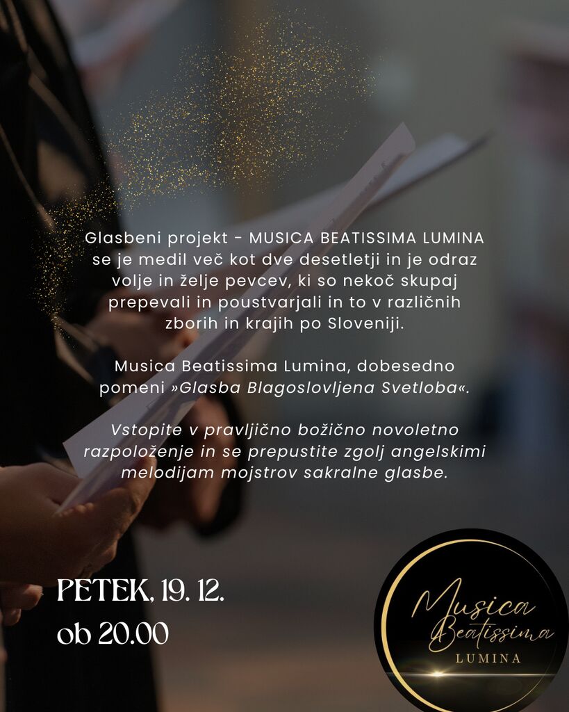Projektni zbor Musica Beatissima Lumina združuje pevke in pevce iz različnih delov Slovenije, ki jih povezuje dolgoletna ljubezen do zborovskega petja. Pod vodstvom Mitje Bervarja izvajajo predvsem sakralne in a cappella skladbe, njihovo ime pa dejansko pomeni Glasba Blagoslovljena Svetloba. V Podpeči bodo predstavili božično-novoletni program, preplet slovenskih božičnih pesmi in sakralnih pesmi, ki obiskovalce popeljejo v umirjeno praznično razpoloženje.