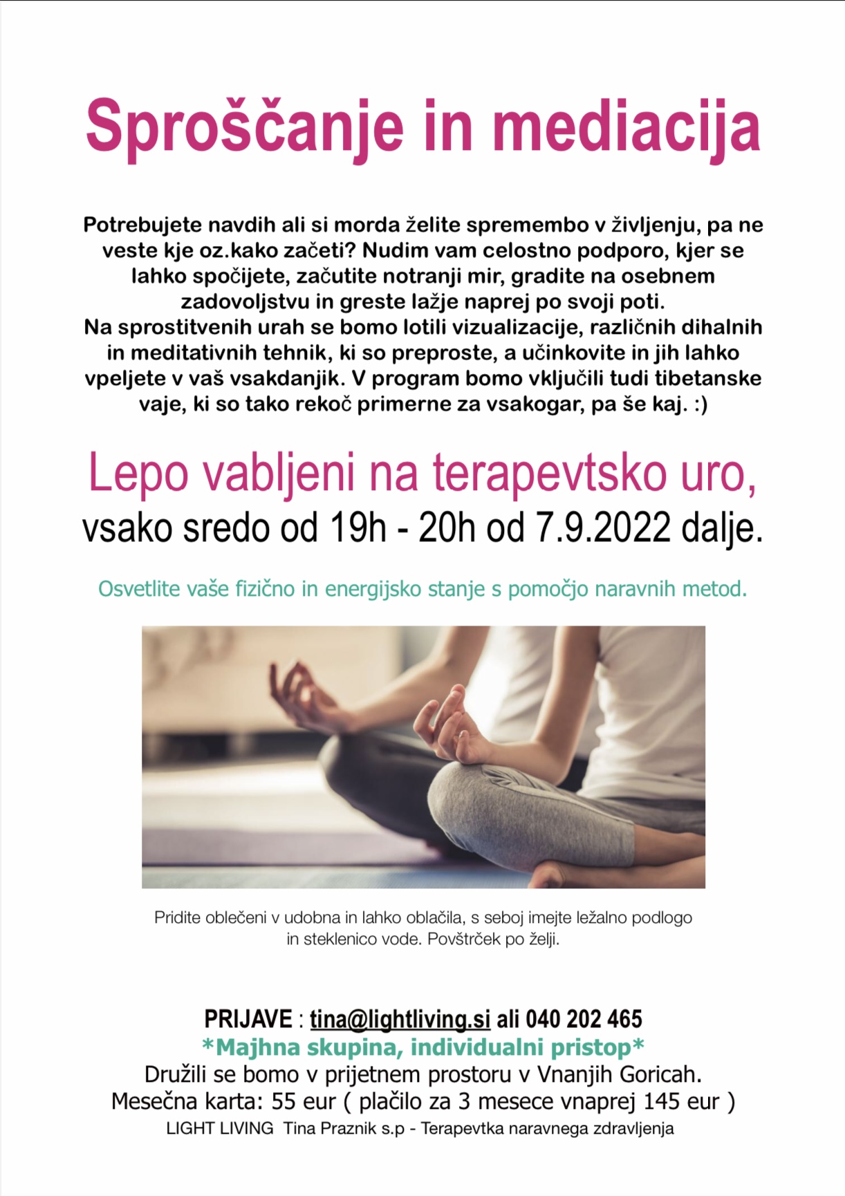 Na sprostitvenih urah se bomo lotili vizualizacije, različnih dihalnih in meditativnih tehnik, ki so preproste, a učinkovite in jih lahko vpeljete v vaš vsakdanjik. V program bomo vključili tudi tibetanske vaje, ki so tako rekoč primerne za vsakogar, pa še kaj. :)