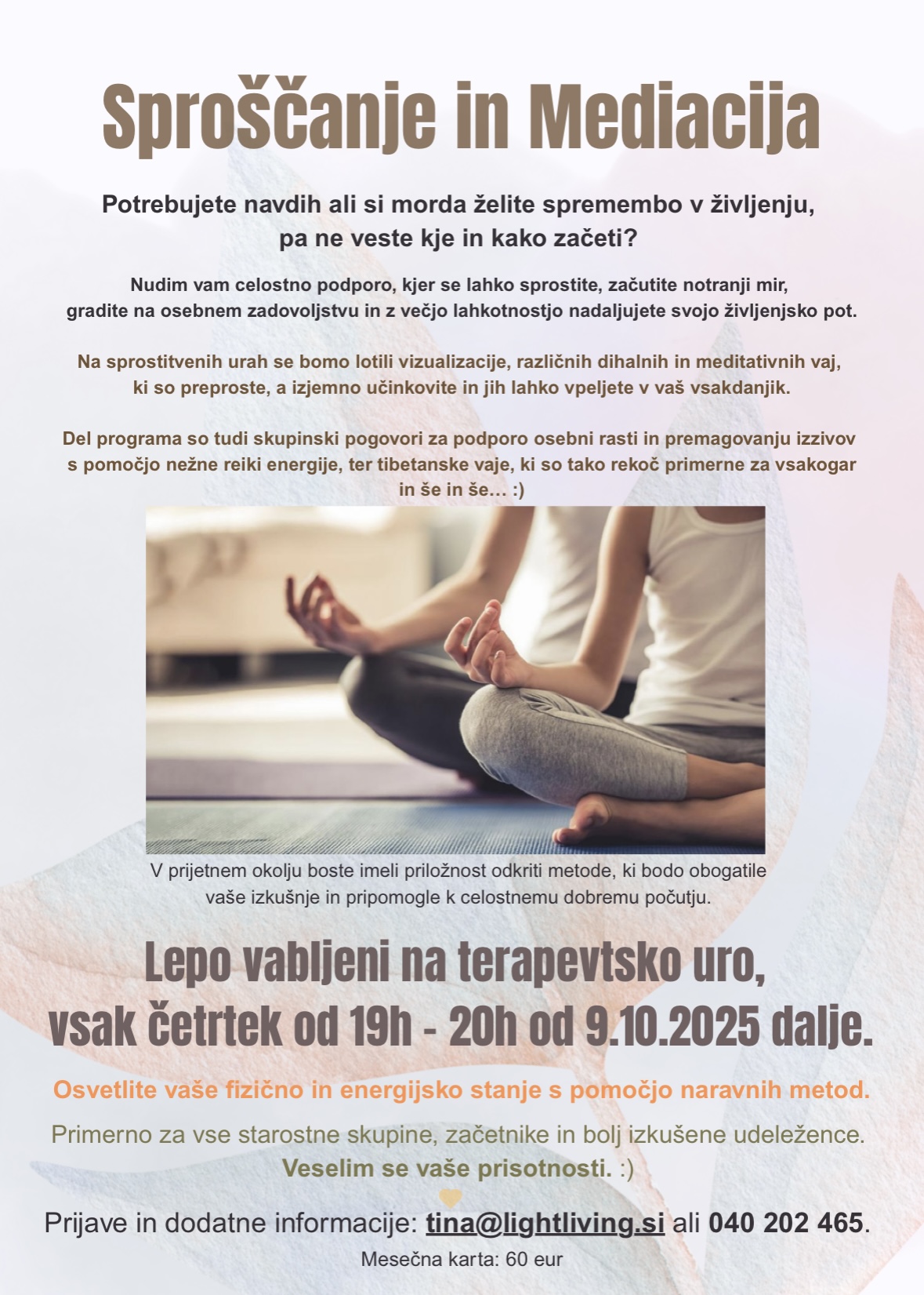 Na sprostitvenih urah se bomo lotili vizualizacije, različnih dihalnih in meditativnih vaj, ki so preproste, a izjemno učinkovite in jih lahko vpeljete v vaš vsakdanjik.