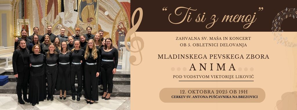 Mladinski pevski zbor Anima, ki deluje pod okriljem župnije Brezovica in Kulturnega društva Breza, se letos veseli 5. obletnice delovanja.Ob tem lepem jubileju vas iskreno vabimo, da se nam pridružite v nedeljo, 12. oktobra 2025, ob 19.00 v cerkvi sv. Antona Puščavnika na Brezovici.