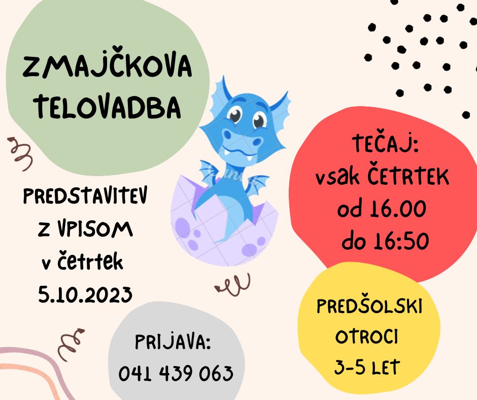 Vsi otroci lepo vabljeni na zmajčkovo telovadbo za otroke od 3 do 5 let. TVsako urico se igramo različne tekaške igre, se učimo gibalno abecedo. V nekatere ure vključimo premagovanje ovir, v druge pa igre z žogo, ali vadbo z drugimi rekviziti. Spoznavamo različna gibanja – tek, poskakovanje, plezanje, plazenje, dviganje, nošenje in metanje. Vsaka urica je drugačna, zato nam nikoli ni dolgčas.