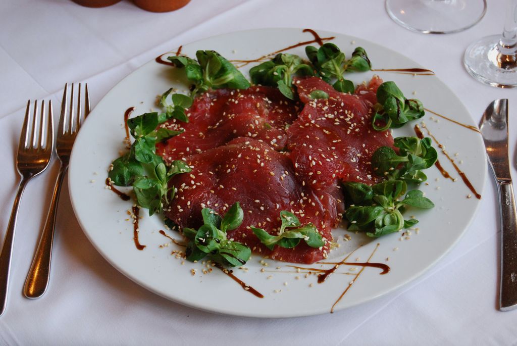 Začetna jed je lahko goveji karpačo, pršut, krožnik suhih briških in krškopoljskih mesnin, hobotnica, različne juhe ali solata, npr. grška ali mediteranska.
