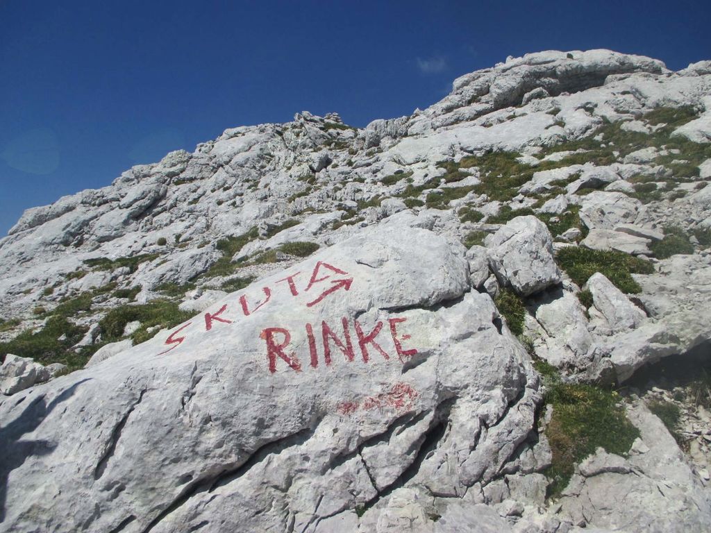 Po mokri noči se je naredilo čisto jutro. Ker smo pričakovali vroč dan, smo štartali še malo bolj zgodaj. Začeli smo v Koncu pri tovorni žičnici na Kokrsko sedlo. Lani smo šli tu skozi Gamsov skret proti Dolgemu hrbtu, letos smo zavili na Žmavčarje proti novemu Bivaku pod Skuto. Po krajšem ogrevanju skozi gozd se pot kaj hitro postavi pokonci. Počasi napredujemo, v daljavi opazimo gamsa, prehodimo melišče, kjer se še strmeje vzpne. Vse bolj smo v osrčju gora. Priplezamo do Bivaka pod Skuto 2070 m, kjer si privoščimo daljši počitek, eni pa si vzamemo čas še za oskrbo ran po padcu na »trdi« skali. Potem nadaljujemo po grebenčku preko Malih podov direktno proti Mali Rinki 2298 m. Naredimo gasilsko sliko, kjer smo še vsi prisotni, nato gre večja skupina naprej, dva pa nazaj proti bivaku. Zdrava skupina, čeprav  je že zelo vroče, hitro napreduje in najprej osvoji najvišjo Kranjsko Rinko 2453 m, nato Križ – Koroško Rinko 2433 m in ob povratku še Štajersko Rinko 2374 m.