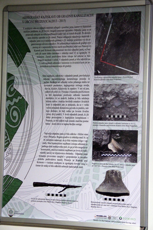 V arheološki testni jami v Črnelniku so bili odkriti masivni nosilni koli, odkrita je bila prostoročno izdelana posoda z držajem ter koščena šila iz koliščarske naselbine v Črnelniku. Med najdbami prevladujejo odlomki različnega keramičnega posodja in pečnic, ena izmed teh je odlomek dna bokala, najdena pri stari šoli v Preserju. Pomemben pa je tudi lovni ali nabiralniški kavelj iz odpadne jame pri stari šoli v Preserju. Razstava bo še nekaj časa na ogled.
