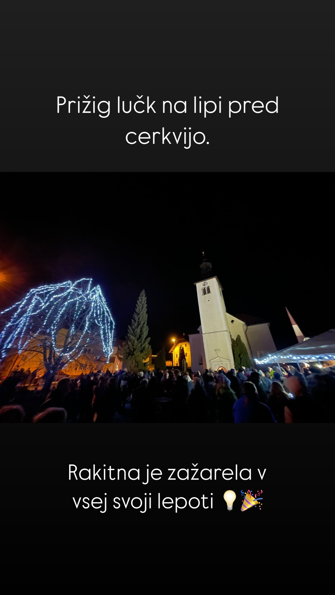 Na zadnji petek v novembru, ko so temperature že nakazale meteorološko zimo, manjkal je samo še sneg, so na Rakitni "Na placi"- pred cerkvijo na lipi, že tretjič zapored na pobudo Turističnega društva Rakitna prižgali praznične novoletne lučke. Okoli lipe so Rakitčanke spletle tudi adventni venec, ki simbolizira adventni čas, v katerega smo vstopili v nedeljo 1. decembra. Poleg luči so lipo olepšali tudi okraski, ki so jih izdelali otroci Podružnične osnovne šole. Dogodek ob prižigu luči pa so popestrili krajani s kulturnim programom, med drugim so otroci Podružnične OŠ Rakitna deklamirali pesem Zimska, Mešani pevski zbor Rakitna pa je pod vodstvom Jelke Kovačič odpel Večerno Jožeta Leskovarja in Božični čas Tomaža Pirnata. Vse krajane in druge, ki so se v petkovem večeru zbrali v lepem številu, je v nagovoru pozdravil Rok Likovič, predsednik Turističnega društva Rakitna. Zatem je s tremi pesmimi večer obogatil še pevski zbor podružnične OŠ Rakitna: otroci pod vodstvom Vide Kržič so odpeli pesem Vesolje, vsem znano Pustite nam ta svet in priredbo pesmi Naj sneži s slovenskim besedilom Ota Pestnerja. Program je popestrila še Vida Slavič z recitacijo Bi bili radi srečni? avtorice Marije Šuštar. Po odštevanju in slavnostnem prižigu luči, ki jih je prižgal eden od izžrebanih otrok, je luči in venec blagoslovil še kaplan Gregor Rogelj, povezovalka prireditve Alenka Kovačič pa je ob koncu otroke povabila k prevzemu darilc. Krajani so se po prireditvi podružili ob čaju in kuhanem vinu, za prijetno vzdušje pa sta poskrbela harmonikar Matevž Juvančič in Žan Mavsar na baritonu.