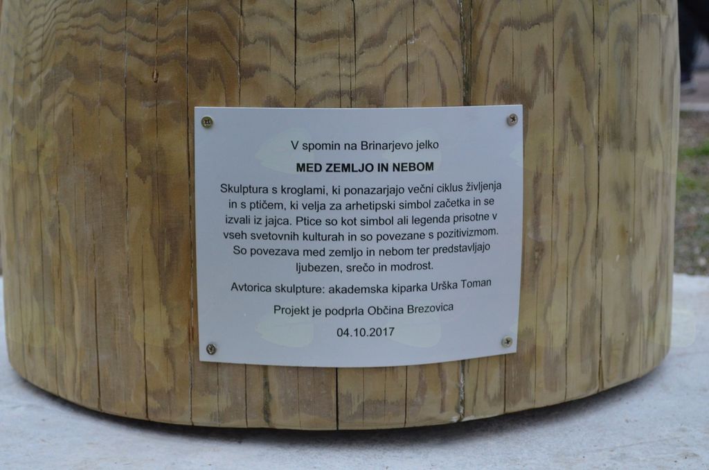 Na koncu se je dotaknil še žalostne zgodbe Brinarjeve jelke in se zahvali ge. Toman za krasno skulpturo, ki naj bo spomin na čudovito jelko in opomin na človeško neumnost in zlobo. Zaključil je s pozitivno noto: »Uživajte v tem, kar je in kar bo še pred nami!«