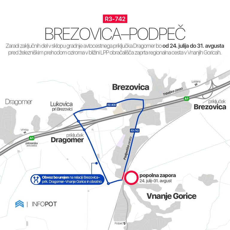 Od 24.7. do 31.8.2025 bo potekala delna zapora Podpeške ceste z občasnimi popolnimi zaporami na delu od ceste na Lazih do avtobusne postaje 6B v Vnanjih Goricah v smeri proti Brezovici.