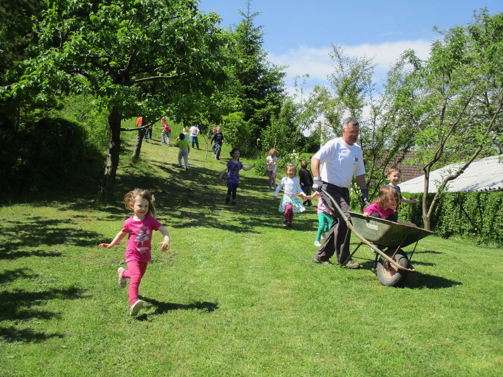 V zelenjavnem vrtu so otroci poznali kar veliko rastlin, saj imajo nekaj zelenjave posejane tudi v vrtcu v lepo urejenih visokih gredah. Še bolj pa je Žabice navdušil sadovnjak, kjer so si ogledali pa tudi preizkusili različna orodja za obrezovanje drevja, obiranje sadja ter košnjo in spravilo trave, najbolj pa jih je navdušila vožnja s samokolnico.