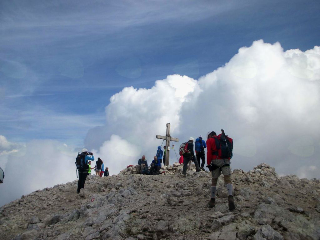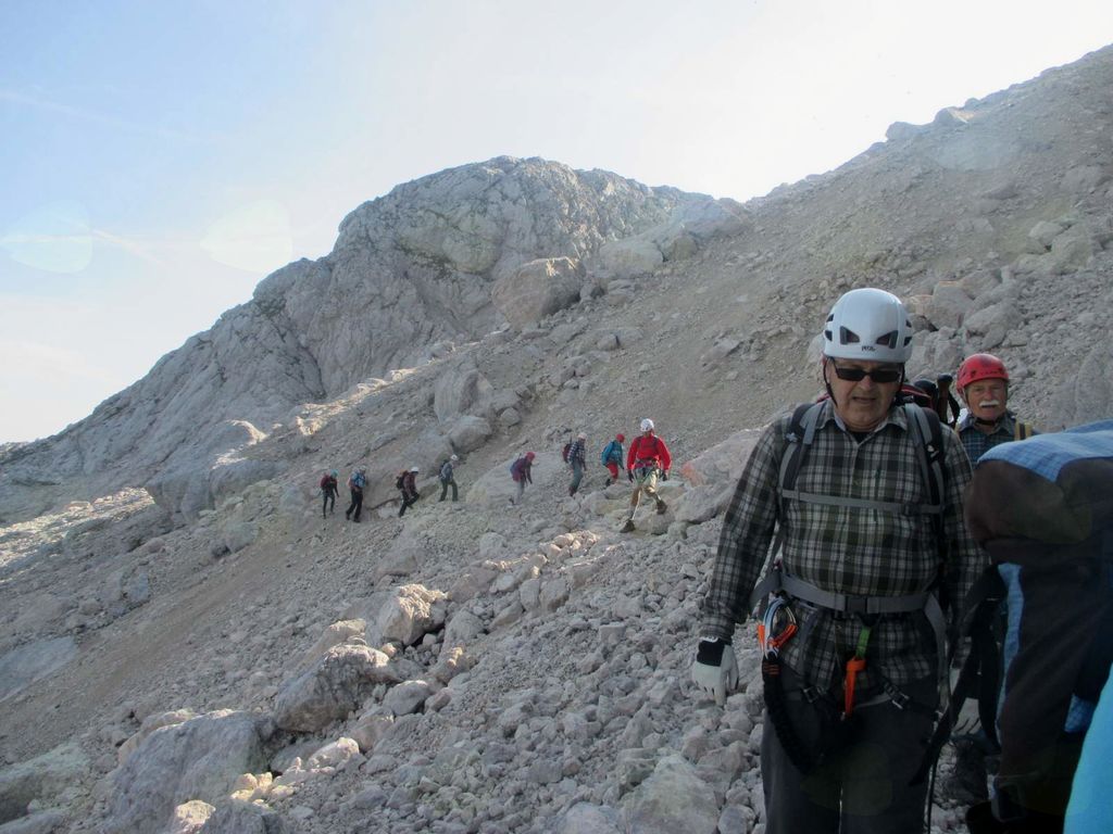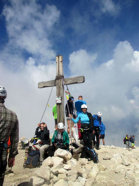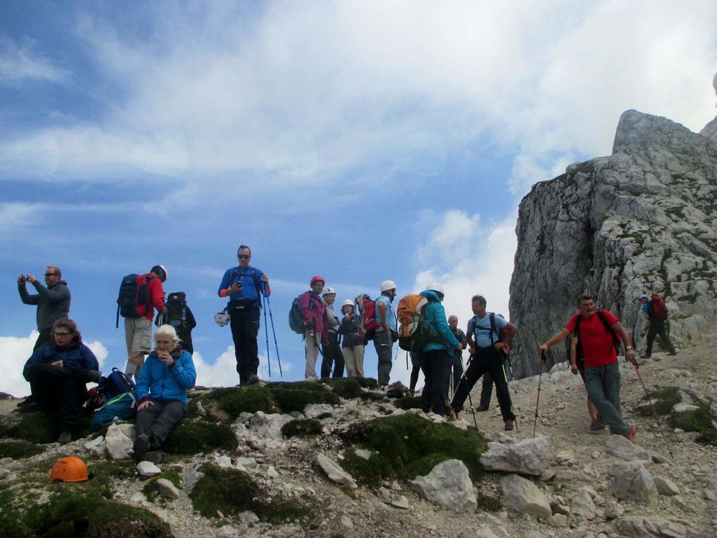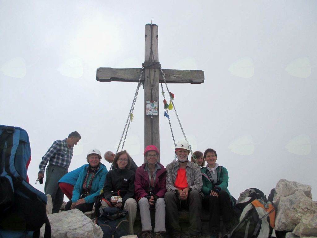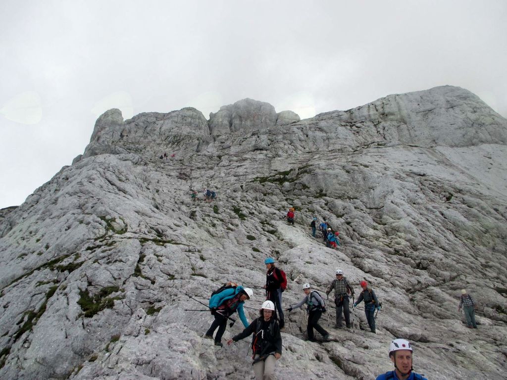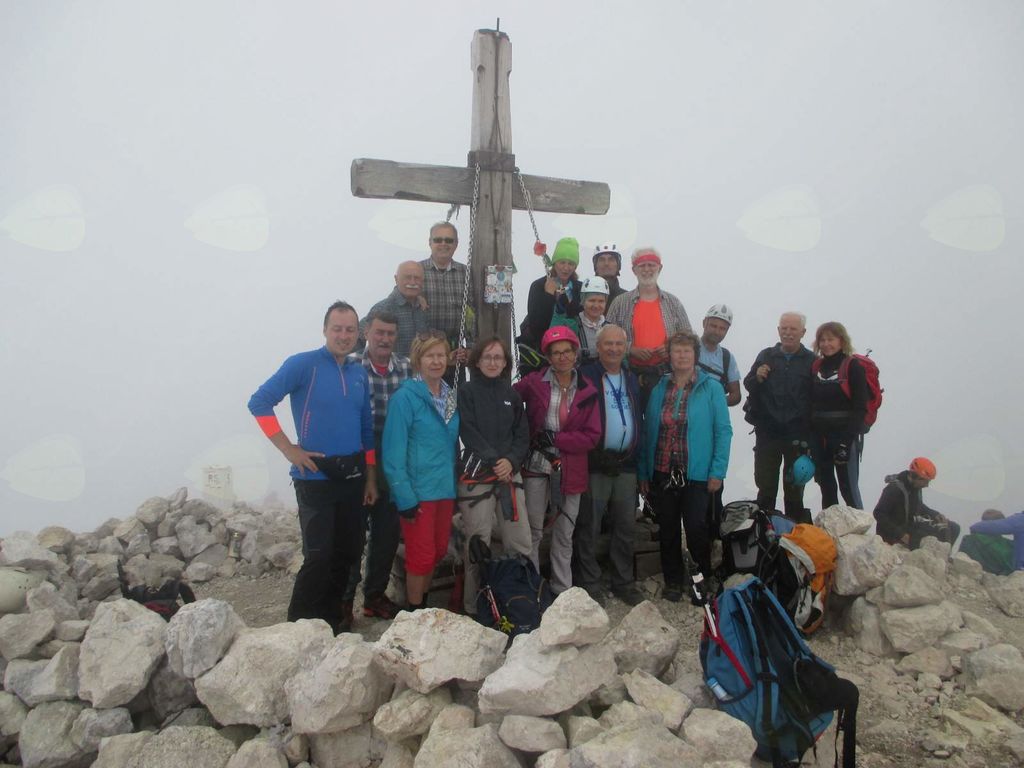 Takoj nas je sprejela lepa narava, z veliko mogočno gmoto nad nami. Žal je bila zastrta s tančico meglic in se nam ni hotela pokazati v vsej svoji mogočnosti.  Zdelo se nam je, da zato ne bo vroče. Počasi se prebijamo po poti do mesta, kjer se pot razdeli v dve smeri. Izberemo si Slovensko, zavarovano plezalno pot. Opremimo se s čeladami, samovarovalnimi pasovi in vstopimo v steno. Strma, na nekaterih delih ozka, prepadna, razgledna, polna klinov, jeklenih stop in jeklenic. Srce zaigra, in ko stopiš vanjo te kar posesa vase in kar ponese proti vrhu. Seveda previdnost ni odveč. Potrebno si je bilo pomagati z rokami in včasih iti po vseh štirih. Klub veliki skupini smo lepo napredovali in kar pozabili na čas. Zdelo se nam je, da smo kar prehitro pred seboj zagledali znameniti »križ«, simbol vrha. Bili smo zelo veseli, razveselilo se nas je tudi sonce, a ne prav za dolgo. Po krajšem počitku smo se fotografirali že v megli. Ravno ko smo hoteli oditi, se je odprlo še enkrat, tako da je nastala »gasilska« fotografija tudi v soncu, potem se je zopet zaprlo. V megli smo se spustili po Italijanski smeri, po drugi strani gore navzdol. Pot je kar strma in polna grušča, tako da tudi tu previdnost ni bila odveč.