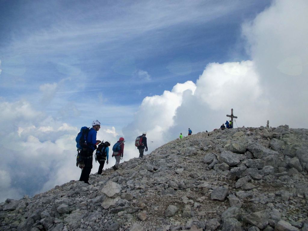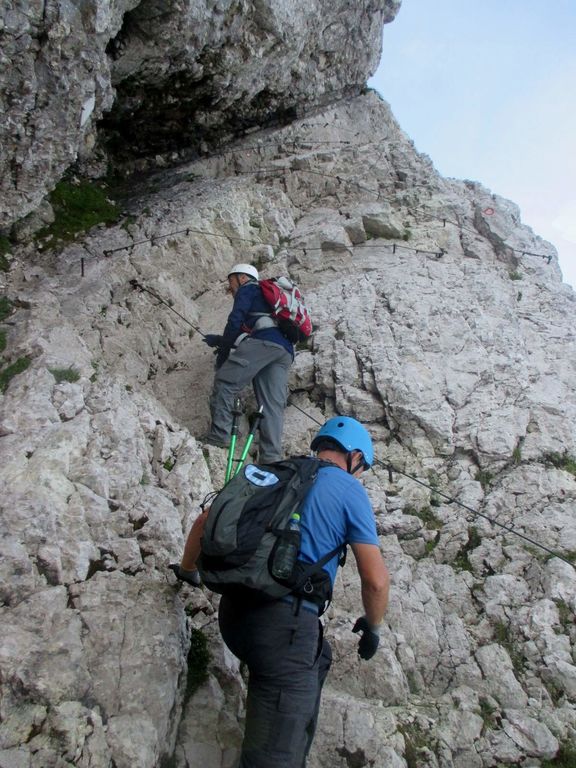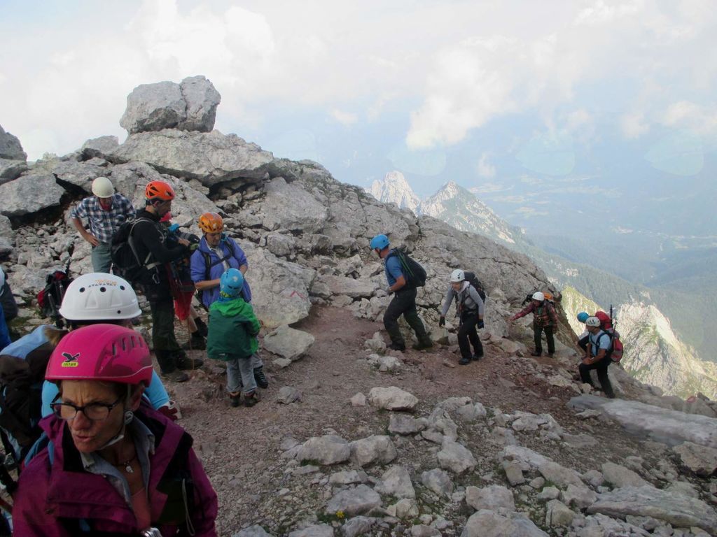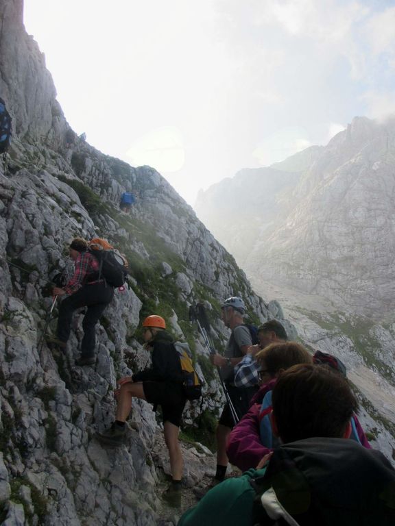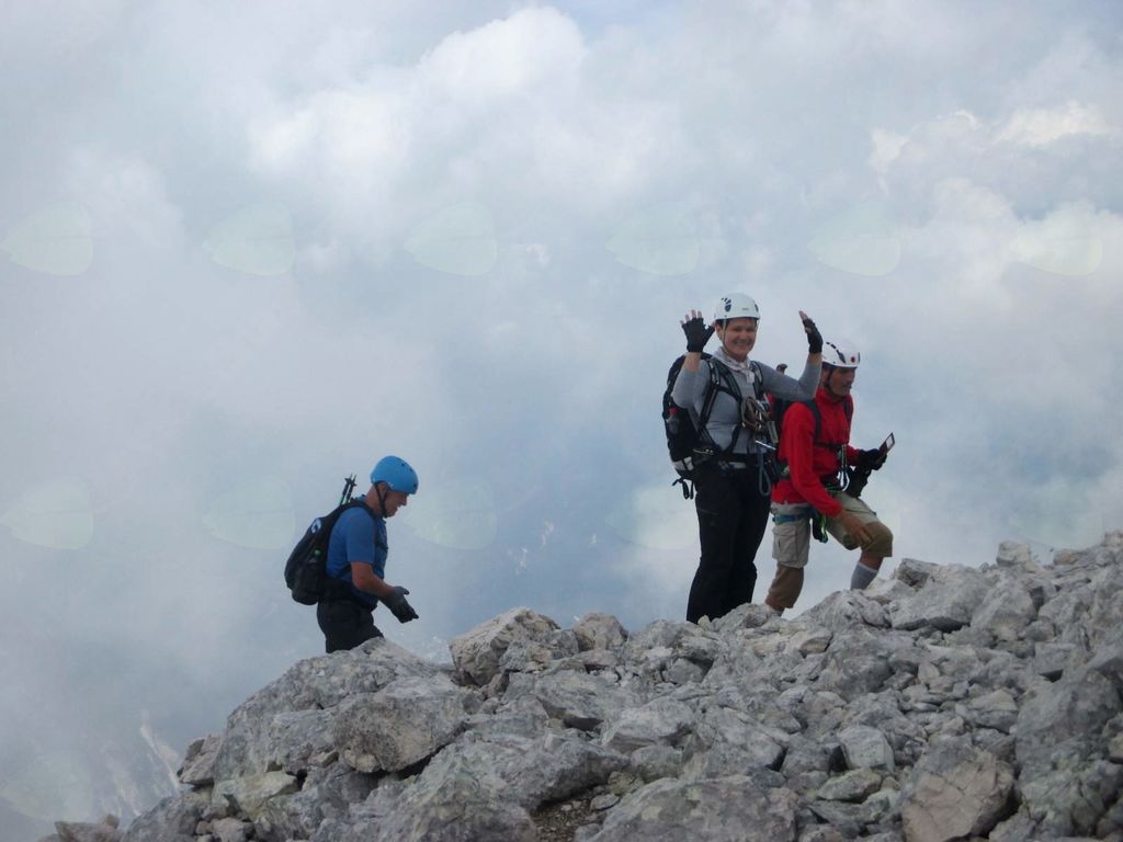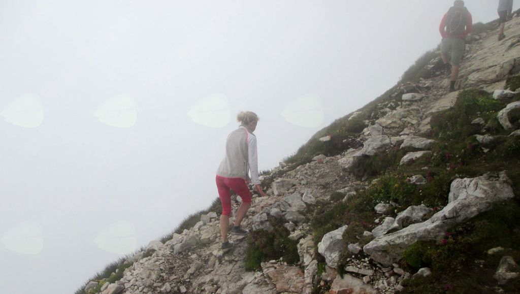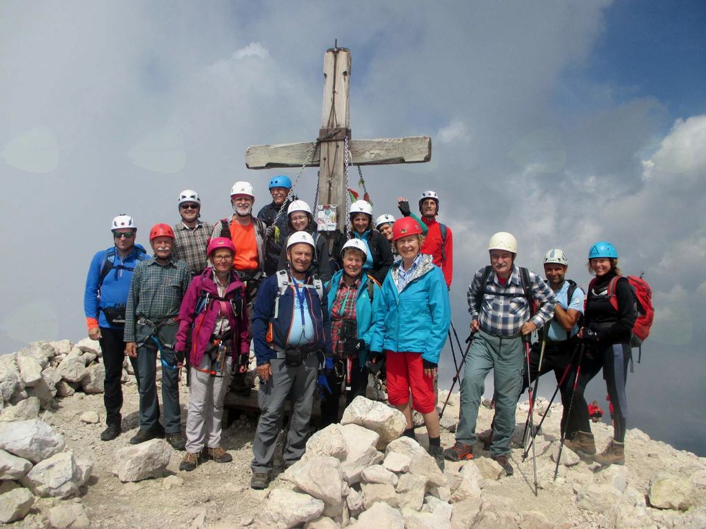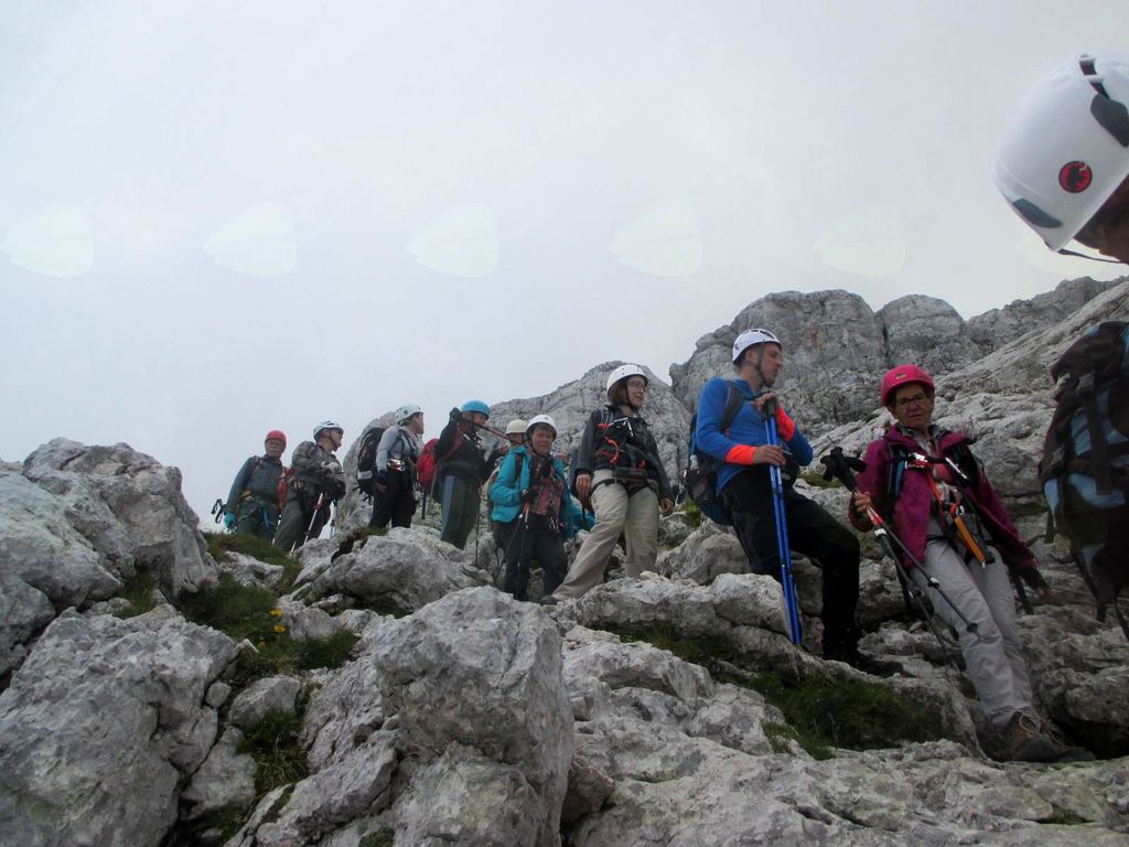 Takoj nas je sprejela lepa narava, z veliko mogočno gmoto nad nami. Žal je bila zastrta s tančico meglic in se nam ni hotela pokazati v vsej svoji mogočnosti.  Zdelo se nam je, da zato ne bo vroče. Počasi se prebijamo po poti do mesta, kjer se pot razdeli v dve smeri. Izberemo si Slovensko, zavarovano plezalno pot. Opremimo se s čeladami, samovarovalnimi pasovi in vstopimo v steno. Strma, na nekaterih delih ozka, prepadna, razgledna, polna klinov, jeklenih stop in jeklenic. Srce zaigra, in ko stopiš vanjo te kar posesa vase in kar ponese proti vrhu. Seveda previdnost ni odveč. Potrebno si je bilo pomagati z rokami in včasih iti po vseh štirih. Klub veliki skupini smo lepo napredovali in kar pozabili na čas. Zdelo se nam je, da smo kar prehitro pred seboj zagledali znameniti »križ«, simbol vrha. Bili smo zelo veseli, razveselilo se nas je tudi sonce, a ne prav za dolgo. Po krajšem počitku smo se fotografirali že v megli. Ravno ko smo hoteli oditi, se je odprlo še enkrat, tako da je nastala »gasilska« fotografija tudi v soncu, potem se je zopet zaprlo. V megli smo se spustili po Italijanski smeri, po drugi strani gore navzdol. Pot je kar strma in polna grušča, tako da tudi tu previdnost ni bila odveč.