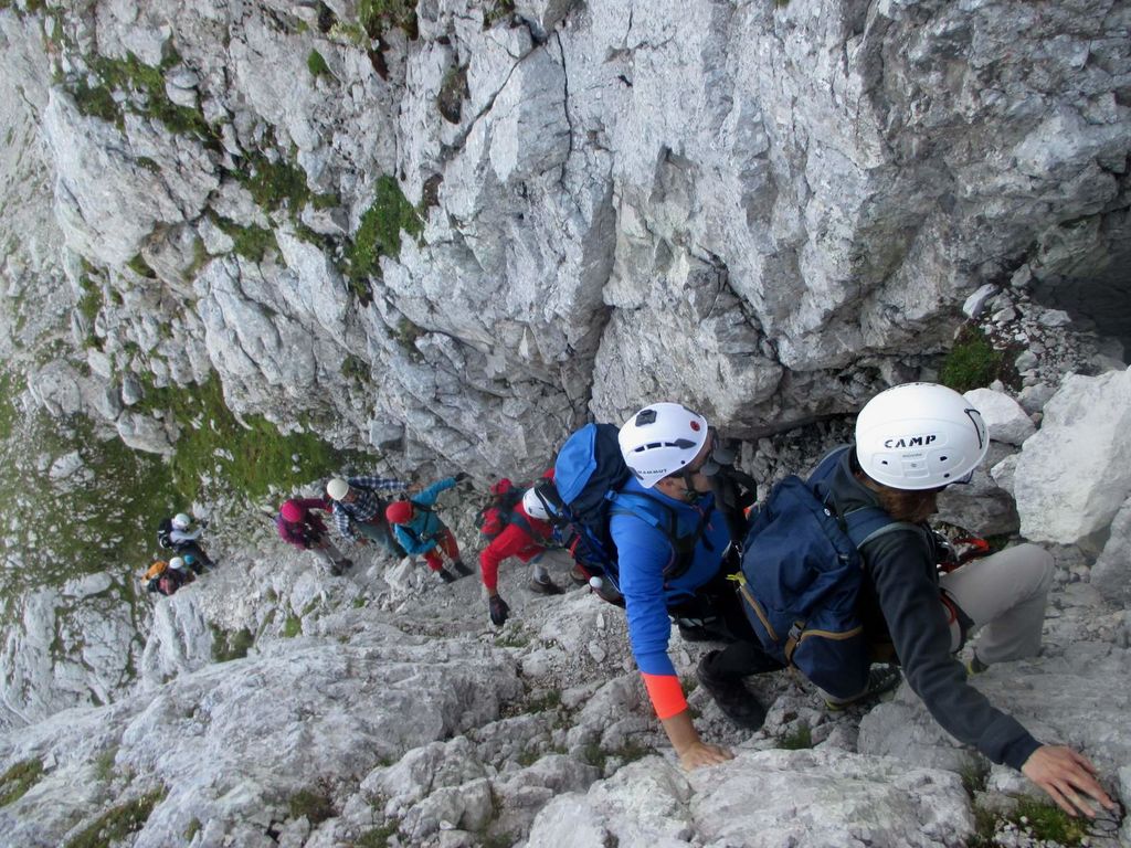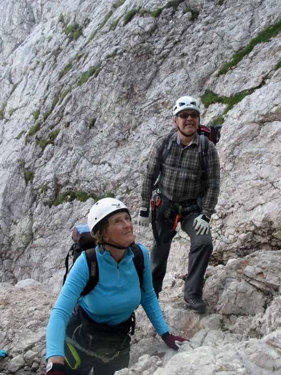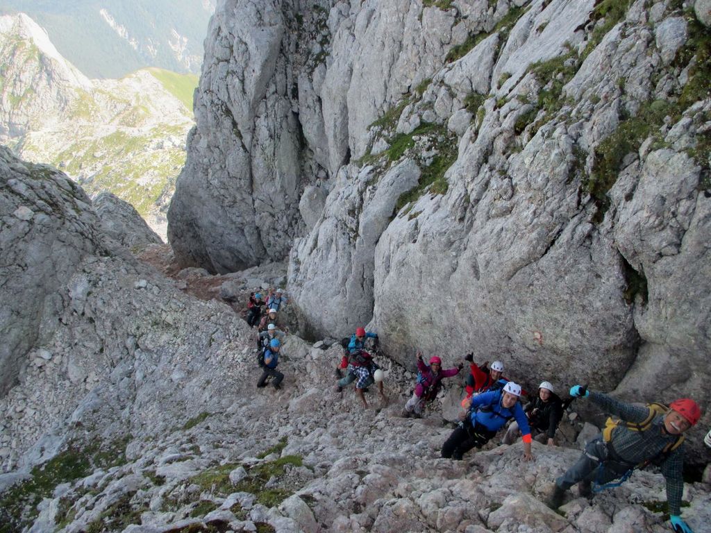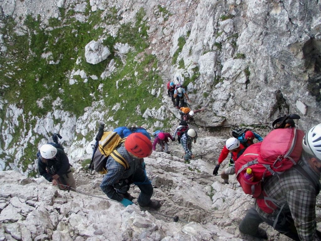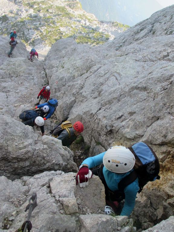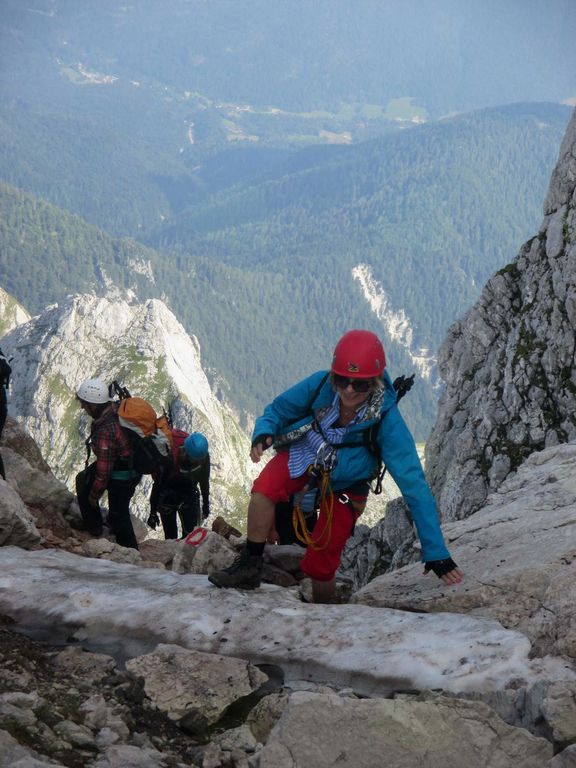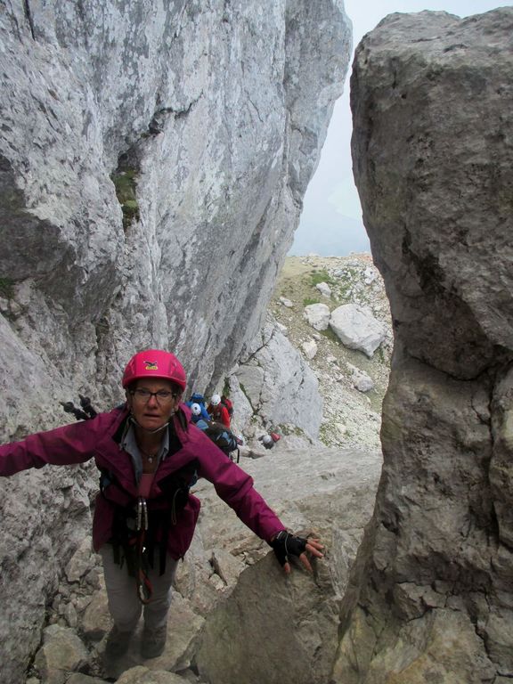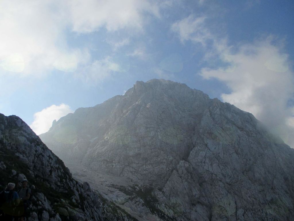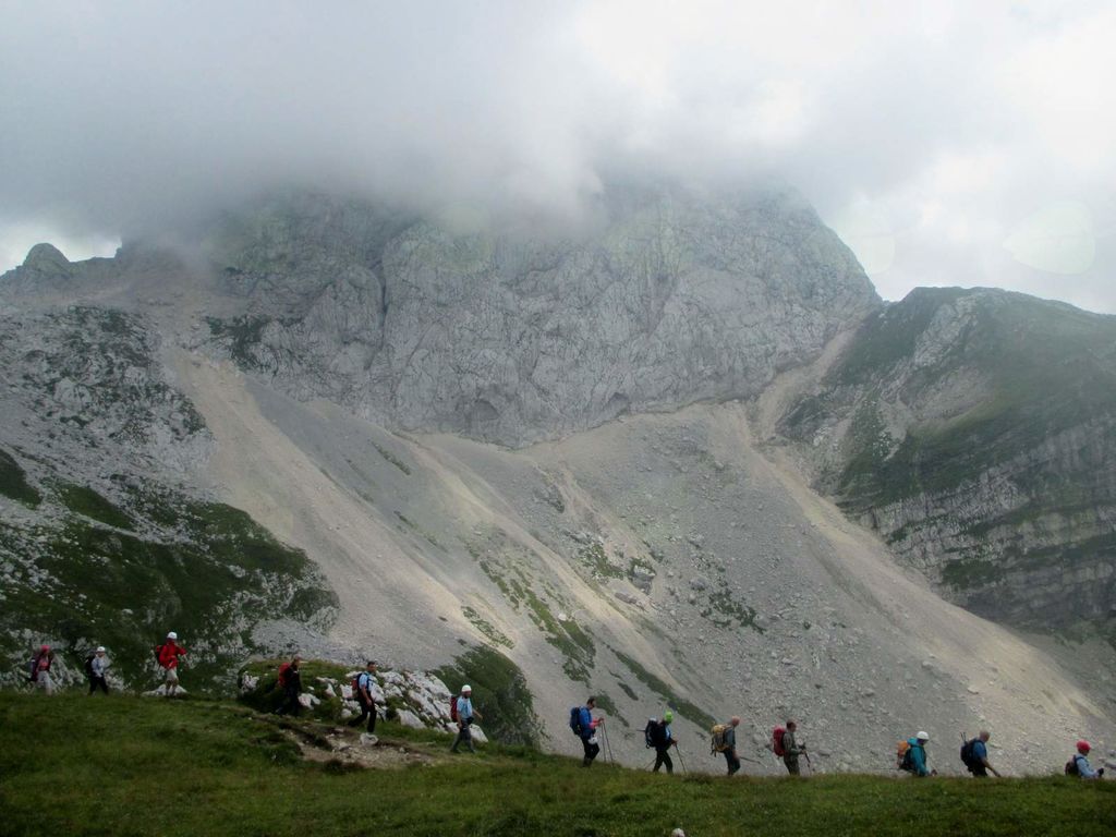 Takoj nas je sprejela lepa narava, z veliko mogočno gmoto nad nami. Žal je bila zastrta s tančico meglic in se nam ni hotela pokazati v vsej svoji mogočnosti.  Zdelo se nam je, da zato ne bo vroče. Počasi se prebijamo po poti do mesta, kjer se pot razdeli v dve smeri. Izberemo si Slovensko, zavarovano plezalno pot. Opremimo se s čeladami, samovarovalnimi pasovi in vstopimo v steno. Strma, na nekaterih delih ozka, prepadna, razgledna, polna klinov, jeklenih stop in jeklenic. Srce zaigra, in ko stopiš vanjo te kar posesa vase in kar ponese proti vrhu. Seveda previdnost ni odveč. Potrebno si je bilo pomagati z rokami in včasih iti po vseh štirih. Klub veliki skupini smo lepo napredovali in kar pozabili na čas. Zdelo se nam je, da smo kar prehitro pred seboj zagledali znameniti »križ«, simbol vrha. Bili smo zelo veseli, razveselilo se nas je tudi sonce, a ne prav za dolgo. Po krajšem počitku smo se fotografirali že v megli. Ravno ko smo hoteli oditi, se je odprlo še enkrat, tako da je nastala »gasilska« fotografija tudi v soncu, potem se je zopet zaprlo. V megli smo se spustili po Italijanski smeri, po drugi strani gore navzdol. Pot je kar strma in polna grušča, tako da tudi tu previdnost ni bila odveč.