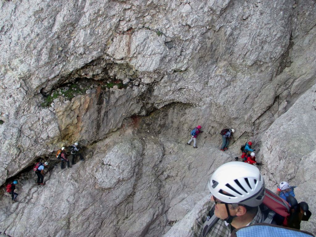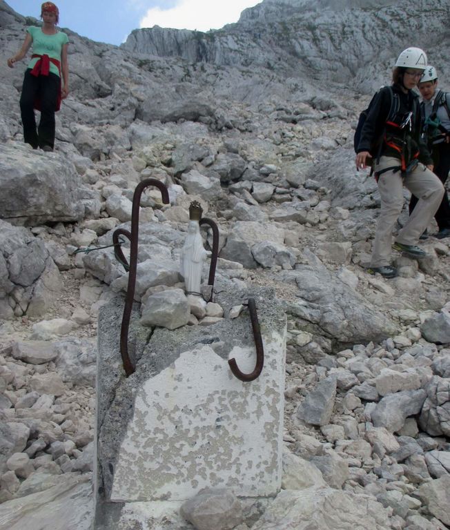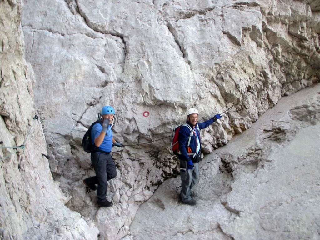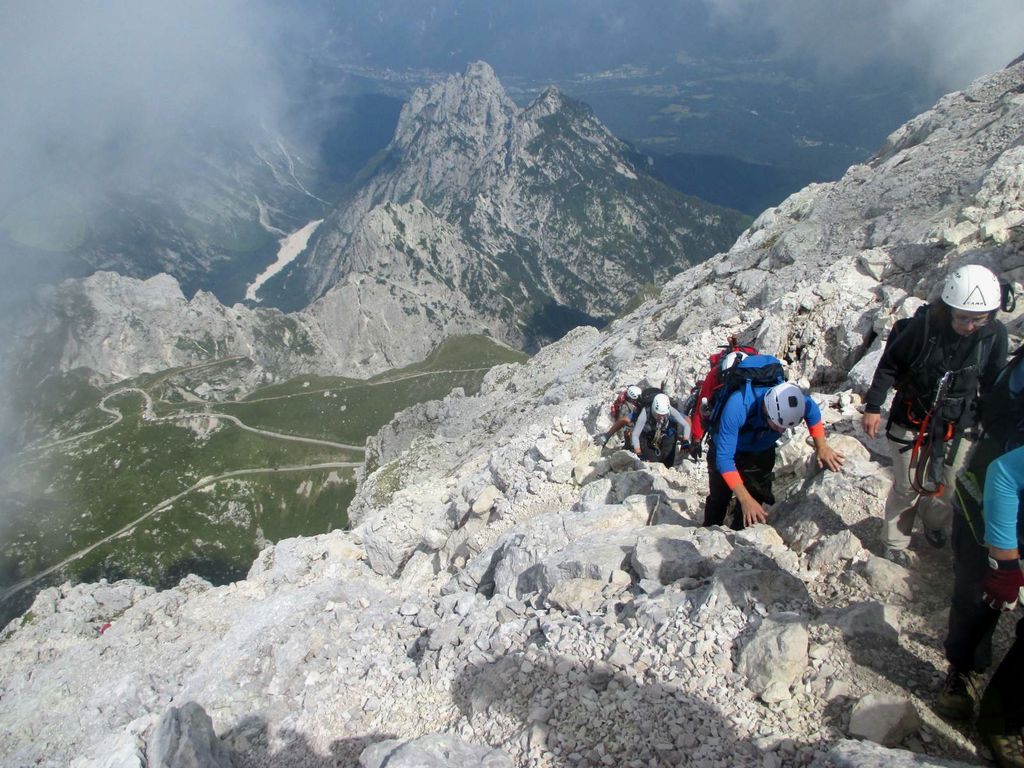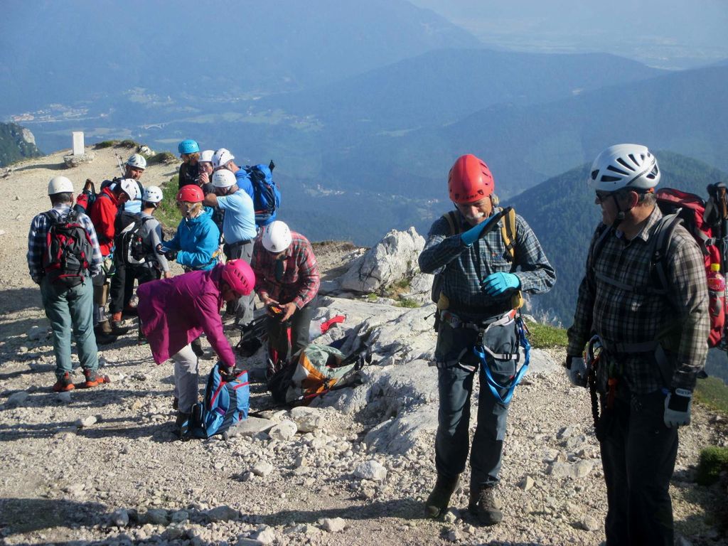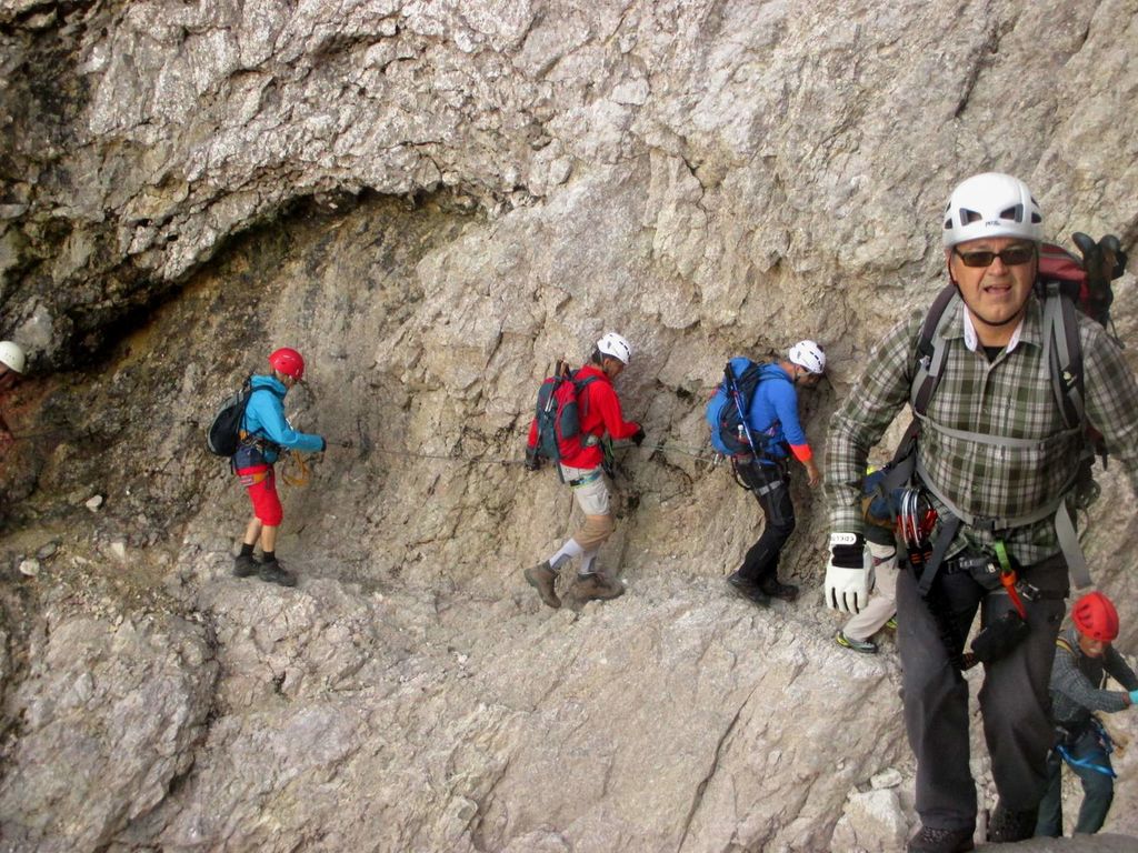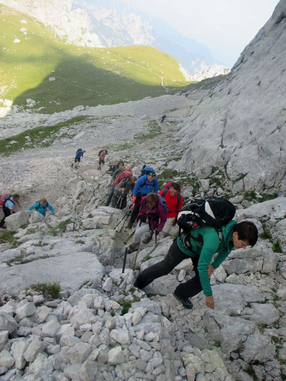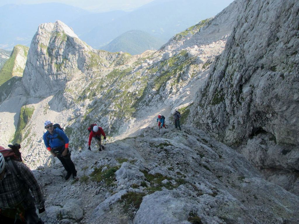 Takoj nas je sprejela lepa narava, z veliko mogočno gmoto nad nami. Žal je bila zastrta s tančico meglic in se nam ni hotela pokazati v vsej svoji mogočnosti.  Zdelo se nam je, da zato ne bo vroče. Počasi se prebijamo po poti do mesta, kjer se pot razdeli v dve smeri. Izberemo si Slovensko, zavarovano plezalno pot. Opremimo se s čeladami, samovarovalnimi pasovi in vstopimo v steno. Strma, na nekaterih delih ozka, prepadna, razgledna, polna klinov, jeklenih stop in jeklenic. Srce zaigra, in ko stopiš vanjo te kar posesa vase in kar ponese proti vrhu. Seveda previdnost ni odveč. Potrebno si je bilo pomagati z rokami in včasih iti po vseh štirih. Klub veliki skupini smo lepo napredovali in kar pozabili na čas. Zdelo se nam je, da smo kar prehitro pred seboj zagledali znameniti »križ«, simbol vrha. Bili smo zelo veseli, razveselilo se nas je tudi sonce, a ne prav za dolgo. Po krajšem počitku smo se fotografirali že v megli. Ravno ko smo hoteli oditi, se je odprlo še enkrat, tako da je nastala »gasilska« fotografija tudi v soncu, potem se je zopet zaprlo. V megli smo se spustili po Italijanski smeri, po drugi strani gore navzdol. Pot je kar strma in polna grušča, tako da tudi tu previdnost ni bila odveč.