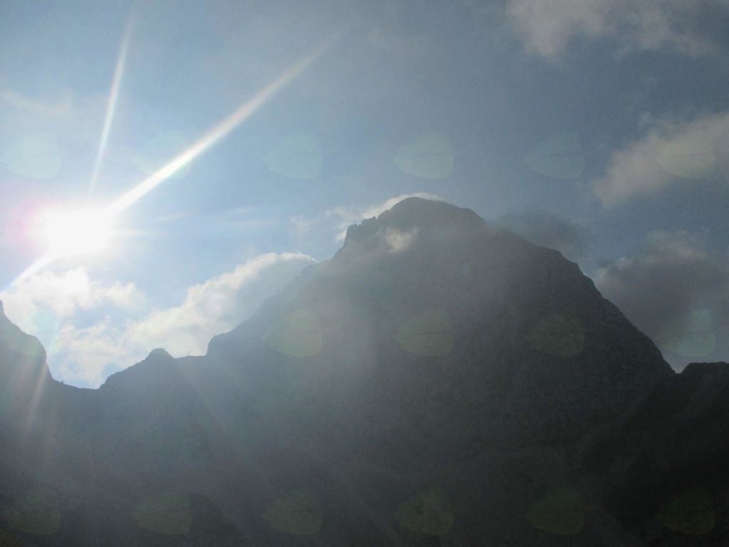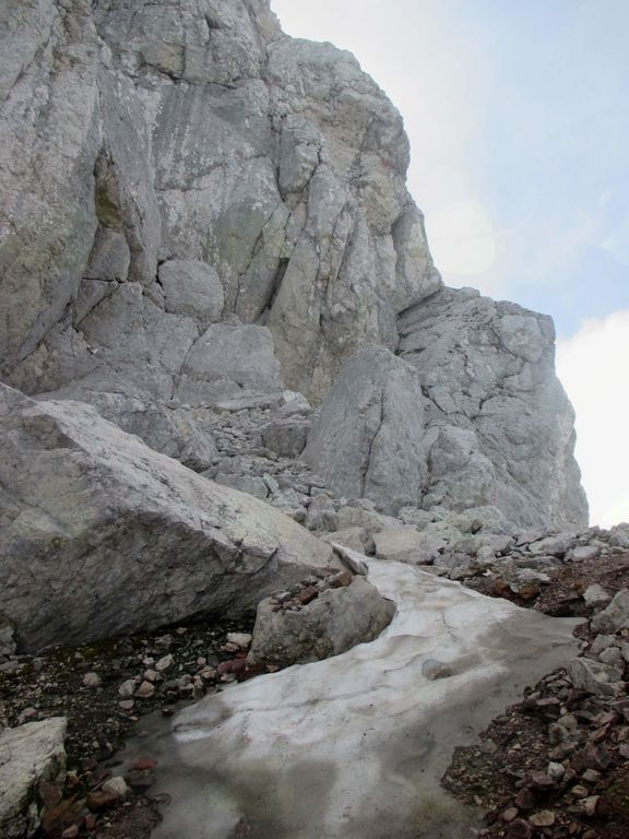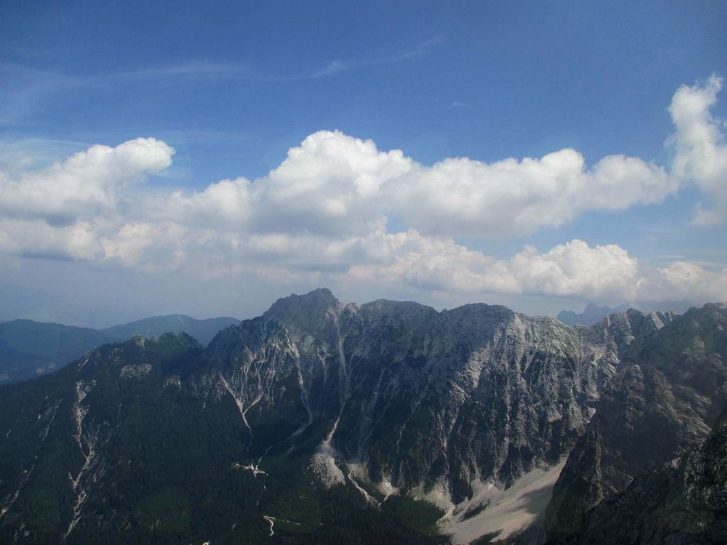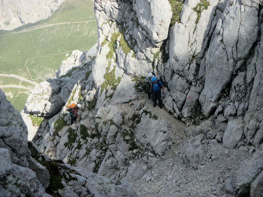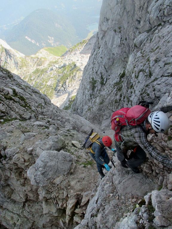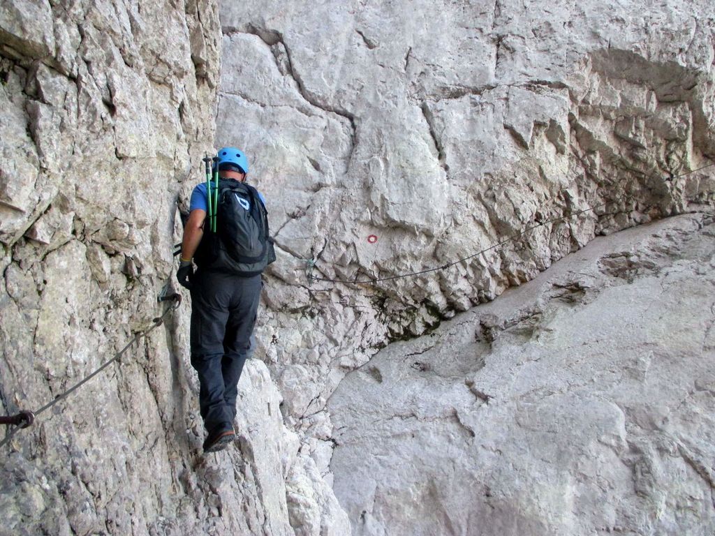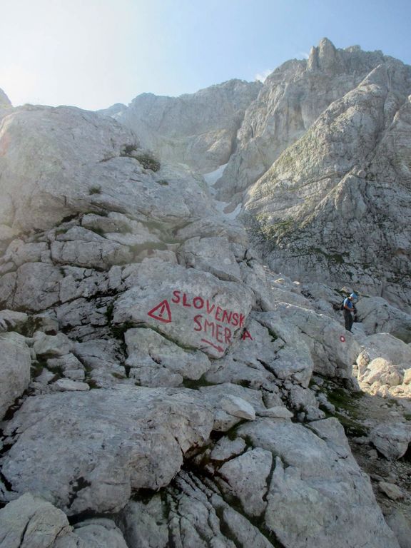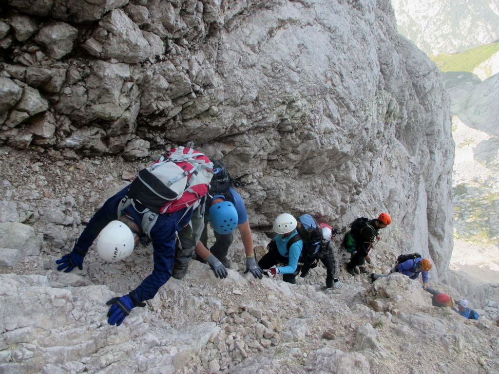 Takoj nas je sprejela lepa narava, z veliko mogočno gmoto nad nami. Žal je bila zastrta s tančico meglic in se nam ni hotela pokazati v vsej svoji mogočnosti.  Zdelo se nam je, da zato ne bo vroče. Počasi se prebijamo po poti do mesta, kjer se pot razdeli v dve smeri. Izberemo si Slovensko, zavarovano plezalno pot. Opremimo se s čeladami, samovarovalnimi pasovi in vstopimo v steno. Strma, na nekaterih delih ozka, prepadna, razgledna, polna klinov, jeklenih stop in jeklenic. Srce zaigra, in ko stopiš vanjo te kar posesa vase in kar ponese proti vrhu. Seveda previdnost ni odveč. Potrebno si je bilo pomagati z rokami in včasih iti po vseh štirih. Klub veliki skupini smo lepo napredovali in kar pozabili na čas. Zdelo se nam je, da smo kar prehitro pred seboj zagledali znameniti »križ«, simbol vrha. Bili smo zelo veseli, razveselilo se nas je tudi sonce, a ne prav za dolgo. Po krajšem počitku smo se fotografirali že v megli. Ravno ko smo hoteli oditi, se je odprlo še enkrat, tako da je nastala »gasilska« fotografija tudi v soncu, potem se je zopet zaprlo. V megli smo se spustili po Italijanski smeri, po drugi strani gore navzdol. Pot je kar strma in polna grušča, tako da tudi tu previdnost ni bila odveč.