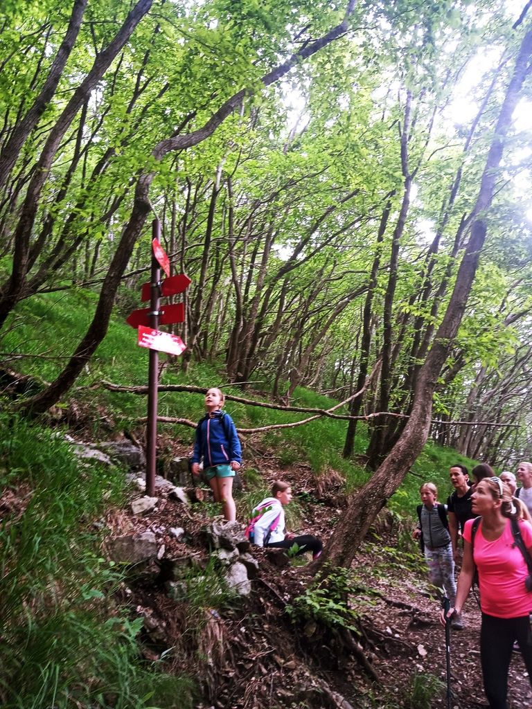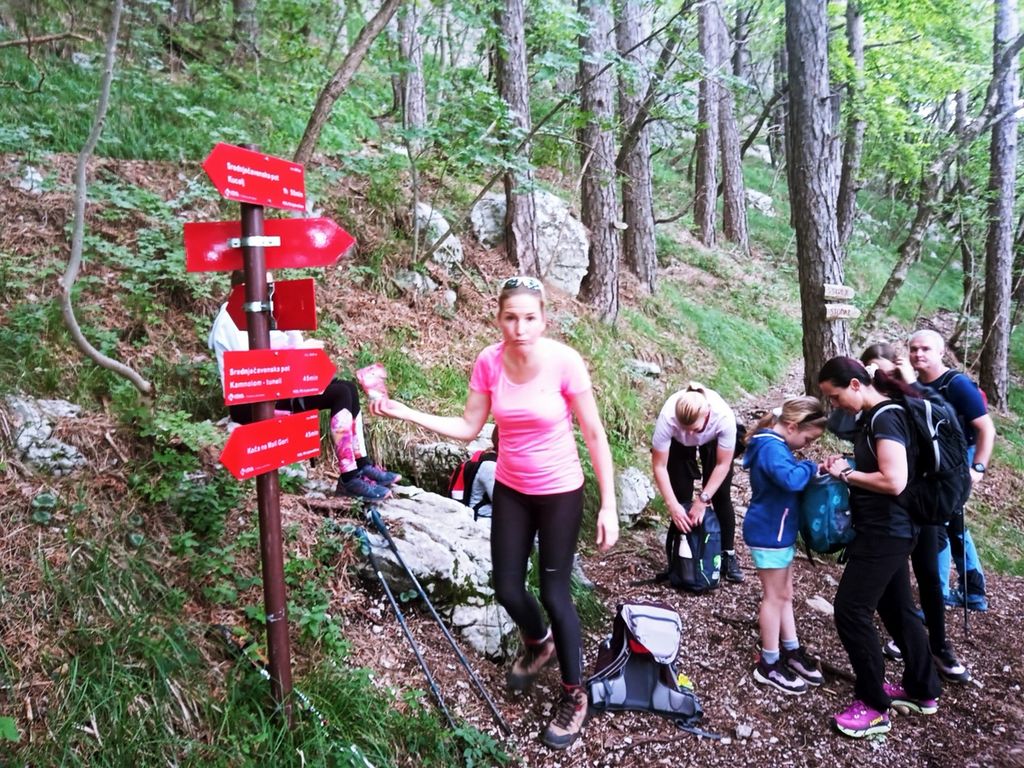 Malo smo se bali prehude primorske vročine, a nam je bilo vreme naklonjeno, malo oblačno in idealno za hojo. Pri tunelih pod Predmejo smo začeli našo pohod. Šli smo po srednje Čavenski poti. Lepa pot po gozdu, v začetku z rahlim vzponom. Prečkali smo melišče, na izpostavljenem delu smo se oprijemali jeklenice. Po kaki uri hoda, pa se je začel kolenogriz, ki nas je pripeljal na pobočje Male Gore. Zelena planina, polna rožic, čudovita in še zadihali smo lahko. Kmalu smo prišli do koče, ki pa ta dan ni bila odprta, je pa nudila klopi in mize, kjer smo prvič lahko pokazali kaj so skrivali naši nahrbtniki. Seveda je bil to le vmesni cilj, čakal nas je vzpon na vrh, ki smo ga lahko le čutili, ker so ga zagrinjali oblaki. Kar nekaj vzpona smo morali še premagati, med tem pa so se oblaki razkadili. Prisopihali smo na vrh, od koder se je videlo do morja in na vse bližnje vrhove. Ker pa ni bil cilj samo osvojiti vrh, smo obiskali še Kočo Antona Bavčerja, kjer nas je že čakal avtobus. Še prej pa smo si malo odpočili in se okrepčali, ter poklepetali z zelo prijaznim oskrbnikom.