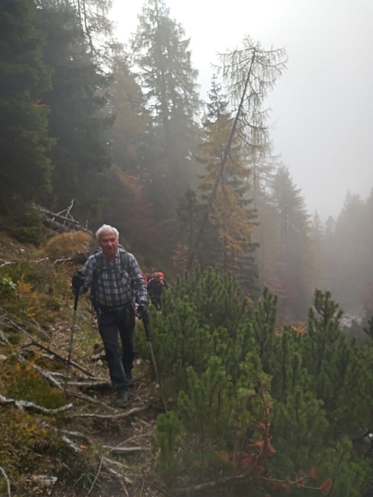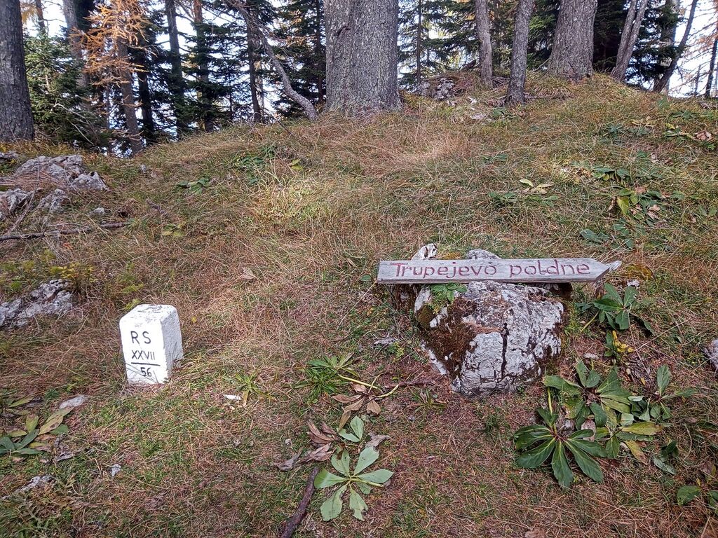 Štartali smo, v kar meglenem in hladnem jutru  v Srednjem vrhu nad Gozdom Martuljkom. Počasi smo se ogrevali s hojo po cesti do Lovske koče za Lepim vrhom. Pot se tu razcepi, mi jo uberemo ob strugi potoka Žlebnica. Lepo sledljiva počasi vzpenjajoča pot. Prvi macesni se že kažejo v čudovitih barvah. Po krajšem počitku nadaljujemo ob suhi strugi hudourniškega potoka. Pot je vse strmejša, preide v dolinico, ki nas pripelje na jaso. Tu izgubimo sled in jo mahnemo po neizrazitih stezicah, vedoč, da je pred nami greben, kjer se bomo navezali na uhojeno stezo. Ko pridemo do nje, se prikaže sonce, ki prijetno greje. Meglice so pod nami. Tudi naš cilj je že viden. Nekaj malega je do sedla, nato še strmina med borovci do vrha. Mejni vrh Trupejevo poldne z naše strani izgleda kar pohleven, medtem ko je z Avstrijske prav prepaden. Lep zvijajoč križ kot bi poplesaval v vetru ga krasi. Seveda je bilo potrebno tudi pozvoniti na zvončku želja. Občudujemo razglede po vrhovih, lepe jesenske barve. Po počitku po grebenu nadaljujemo do odcepa za lovsko kočo v Železnici. Sledi dolgotrajen spust po kolovozu na izhodišče.